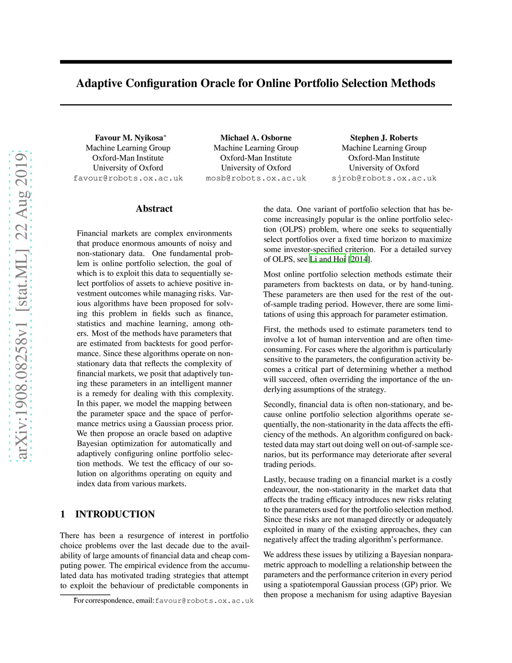 Financial markets are complex environments that produce enormous amounts of noisy and non-stationary data. One fundamental problem is online portfolio selection, the goal of which is to exploit this data to sequentially select portfolios of assets to achieve positive investment outcomes while managing risks. Various algorithms have been proposed for solving this problem in fields such as finance, statistics and machine learning, among others. Most of the methods have parameters that are estimated from backtests for good performance. Since these algorithms operate on non-stationary data that reflects the complexity of financial markets, we posit that adaptively tuning these parameters in an intelligent manner is a remedy for dealing with this complexity. In this paper, we model the mapping between the parameter space and the space of performance metrics using a Gaussian process prior. We then propose an oracle based on adaptive Bayesian optimization for automatically and adaptively configuring online portfolio selection methods. We test the efficacy of our solution on algorithms operating on equity and index data from various markets.