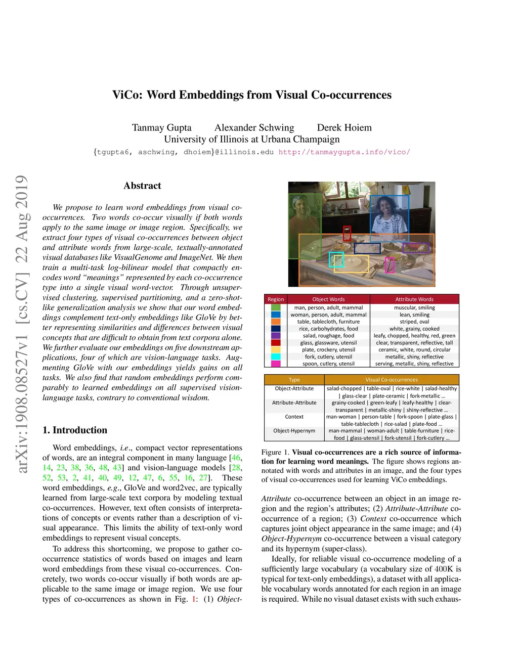 We propose to learn word embeddings from visual co-occurrences. Two words co-occur visually if both words apply to the same image or image region. Specifically, we extract four types of visual co-occurrences between object and attribute words from large-scale, textually-annotated visual databases like VisualGenome and ImageNet. We then train a multi-task log-bilinear model that compactly encodes word "meanings" represented by each co-occurrence type into a single visual word-vector. Through unsupervised clustering, supervised partitioning, and a zero-shot-like generalization analysis we show that our word embeddings complement text-only embeddings like GloVe by better representing similarities and differences between visual concepts that are difficult to obtain from text corpora alone. We further evaluate our embeddings on five downstream applications, four of which are vision-language tasks. Augmenting GloVe with our embeddings yields gains on all tasks. We also find that random embeddings perform comparably to learned embeddings on all supervised vision-language tasks, contrary to conventional wisdom.