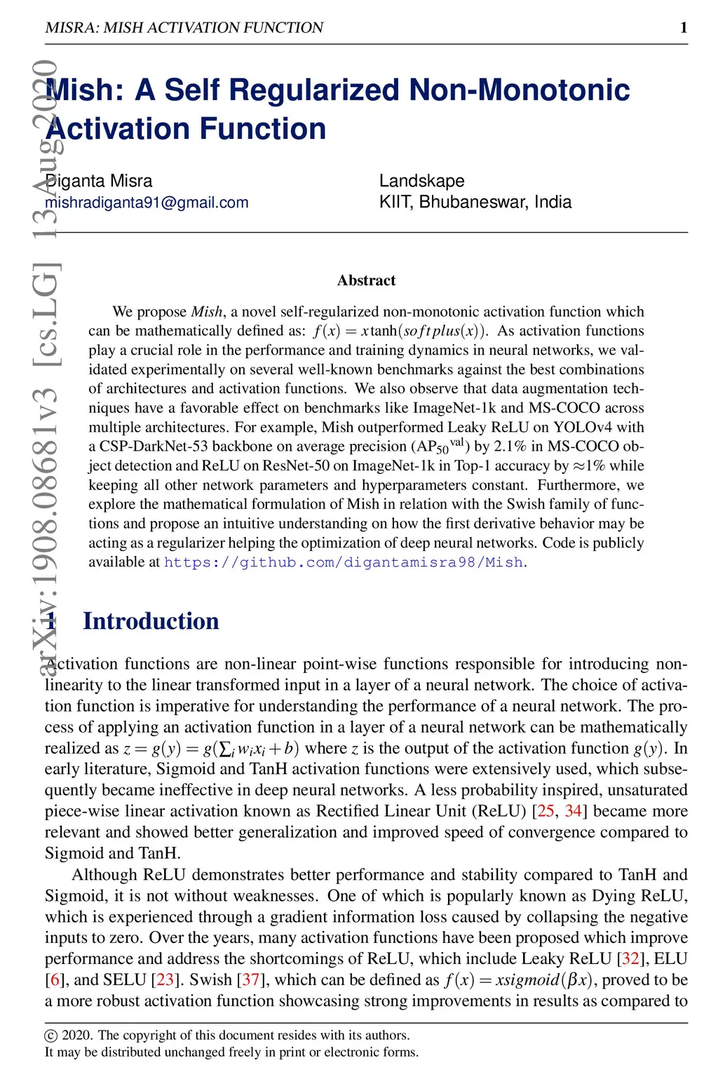 Mish: A Self Regularized Non-Monotonic Activation Function
