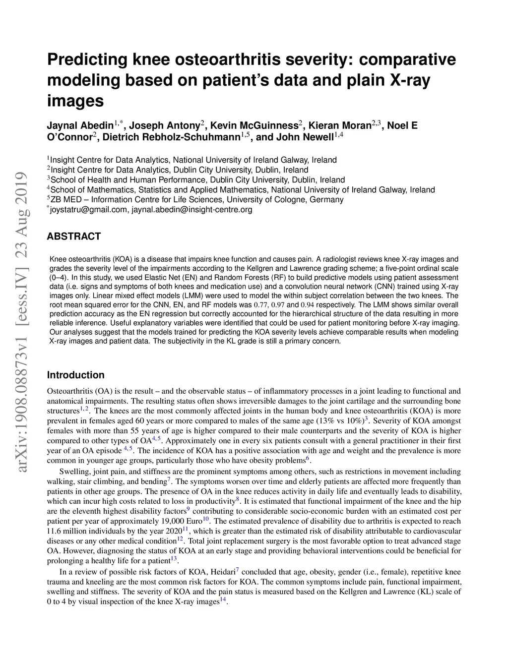 Knee osteoarthritis (KOA) is a disease that impairs knee function and causes pain. A radiologist reviews knee X-ray images and grades the severity level of the impairments according to the Kellgren and Lawrence grading scheme; a five-point ordinal scale (0--4). In this study, we used Elastic Net (EN) and Random Forests (RF) to build predictive models using patient assessment data (i.e. signs and symptoms of both knees and medication use) and a convolution neural network (CNN) trained using X-ray images only. Linear mixed effect models (LMM) were used to model the within subject correlation between the two knees. The root mean squared error for the CNN, EN, and RF models was 0.77, 0.97, and 0.94 respectively. The LMM shows similar overall prediction accuracy as the EN regression but correctly accounted for the hierarchical structure of the data resulting in more reliable inference. Useful explanatory variables were identified that could be used for patient monitoring before X-ray imaging. Our analyses suggest that the models trained for predicting the KOA severity levels achieve comparable results when modeling X-ray images and patient data. The subjectivity in the KL grade is still a primary concern.