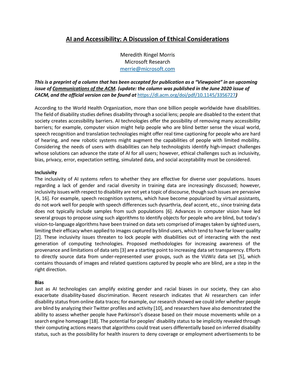 According to the World Health Organization, more than one billion people worldwide have disabilities. The field of disability studies defines disability through a social lens; people are disabled to the extent that society creates accessibility barriers. AI technologies offer the possibility of removing many accessibility barriers; for example, computer vision might help people who are blind better sense the visual world, speech recognition and translation technologies might offer real time captioning for people who are hard of hearing, and new robotic systems might augment the capabilities of people with limited mobility. Considering the needs of users with disabilities can help technologists identify high-impact challenges whose solutions can advance the state of AI for all users; however, ethical challenges such as inclusivity, bias, privacy, error, expectation setting, simulated data, and social acceptability must be considered.