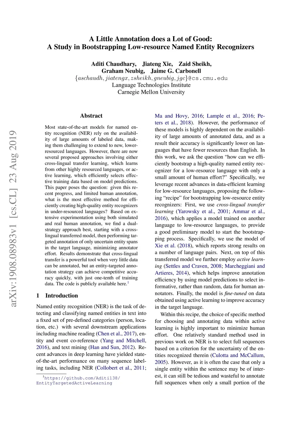 Most state-of-the-art models for named entity recognition (NER) rely on the availability of large amounts of labeled data, making them challenging to extend to new, lower-resourced languages. However, there are now several proposed approaches involving either cross-lingual transfer learning, which learns from other highly resourced languages, or active learning, which efficiently selects effective training data based on model predictions. This paper poses the question: given this recent progress, and limited human annotation, what is the most effective method for efficiently creating high-quality entity recognizers in under-resourced languages? Based on extensive experimentation using both simulated and real human annotation, we find a dual-strategy approach best, starting with a cross-lingual transferred model, then performing targeted annotation of only uncertain entity spans in the target language, minimizing annotator effort. Results demonstrate that cross-lingual transfer is a powerful tool when very little data can be annotated, but an entity-targeted annotation strategy can achieve competitive accuracy quickly, with just one-tenth of training data.