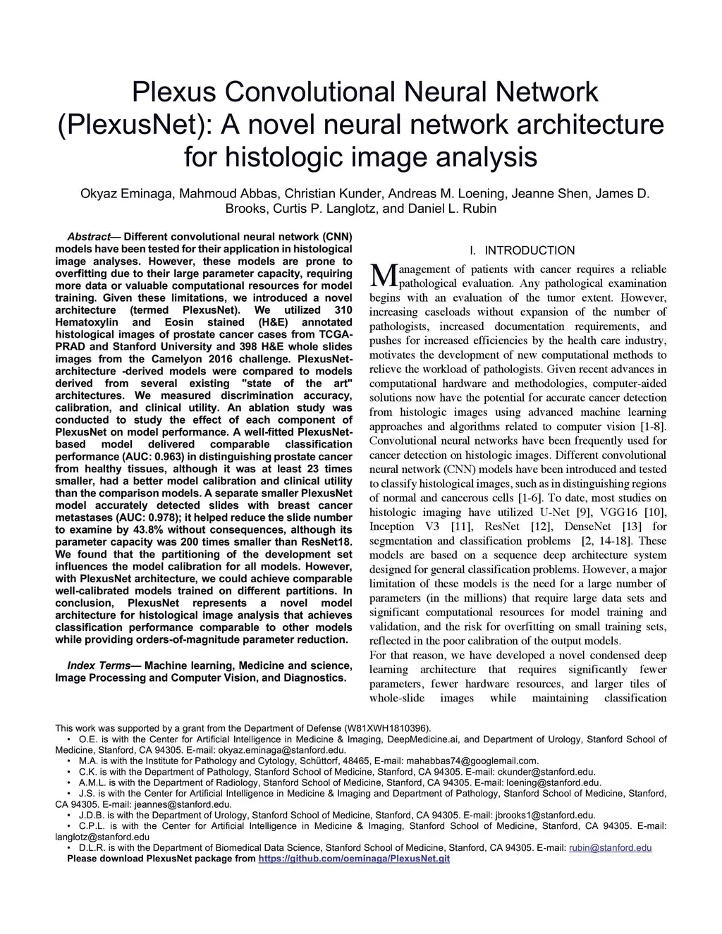 Different convolutional neural network (CNN) models have been tested for their application in histological image analyses. However, these models are prone to overfitting due to their large parameter capacity, requiring more data or valuable computational resources for model training. Given these limitations, we introduced a novel architecture (termed PlexusNet). We utilized 310 Hematoxylin and Eosin stained (H&E) annotated histological images of prostate cancer cases from TCGA-PRAD and Stanford University and 398 H&E whole slides images from the Camelyon 2016 challenge. PlexusNet-architecture -derived models were compared to models derived from several existing "state of the art" architectures. We measured discrimination accuracy, calibration, and clinical utility. An ablation study was conducted to study the effect of each component of PlexusNet on model performance. A well-fitted PlexusNet-based model delivered comparable classification performance (AUC: 0.963) in distinguishing prostate cancer from healthy tissues, although it was at least 23 times smaller, had a better model calibration and clinical utility than the comparison models. A separate smaller PlexusNet model accurately detected slides with breast cancer metastases (AUC: 0.978); it helped reduce the slide number to examine by 43.8% without consequences, although its parameter capacity was 200 times smaller than ResNet18. We found that the partitioning of the development set influences the model calibration for all models. However, with PlexusNet architecture, we could achieve comparable well-calibrated models trained on different partitions. In conclusion, PlexusNet represents a novel model architecture for histological image analysis that achieves classification performance comparable to other models while providing orders-of-magnitude parameter reduction.