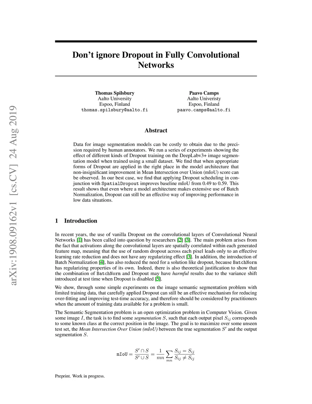 Data for Image segmentation models can be costly to obtain due to the precision required by human annotators. We run a series of experiments showing the effect of different kinds of Dropout training on the DeepLabv3+ Image segmentation model when trained using a small dataset. We find that when appropriate forms of Dropout are applied in the right place in the model architecture that non-insignificant improvement in Mean Intersection over Union (mIoU) score can be observed. In our best case, we find that applying Dropout scheduling in conjunction with SpatialDropout improves baseline mIoU from 0.49 to 0.59. This result shows that even where a model architecture makes extensive use of Batch Normalization, Dropout can still be an effective way of improving performance in low data situations.