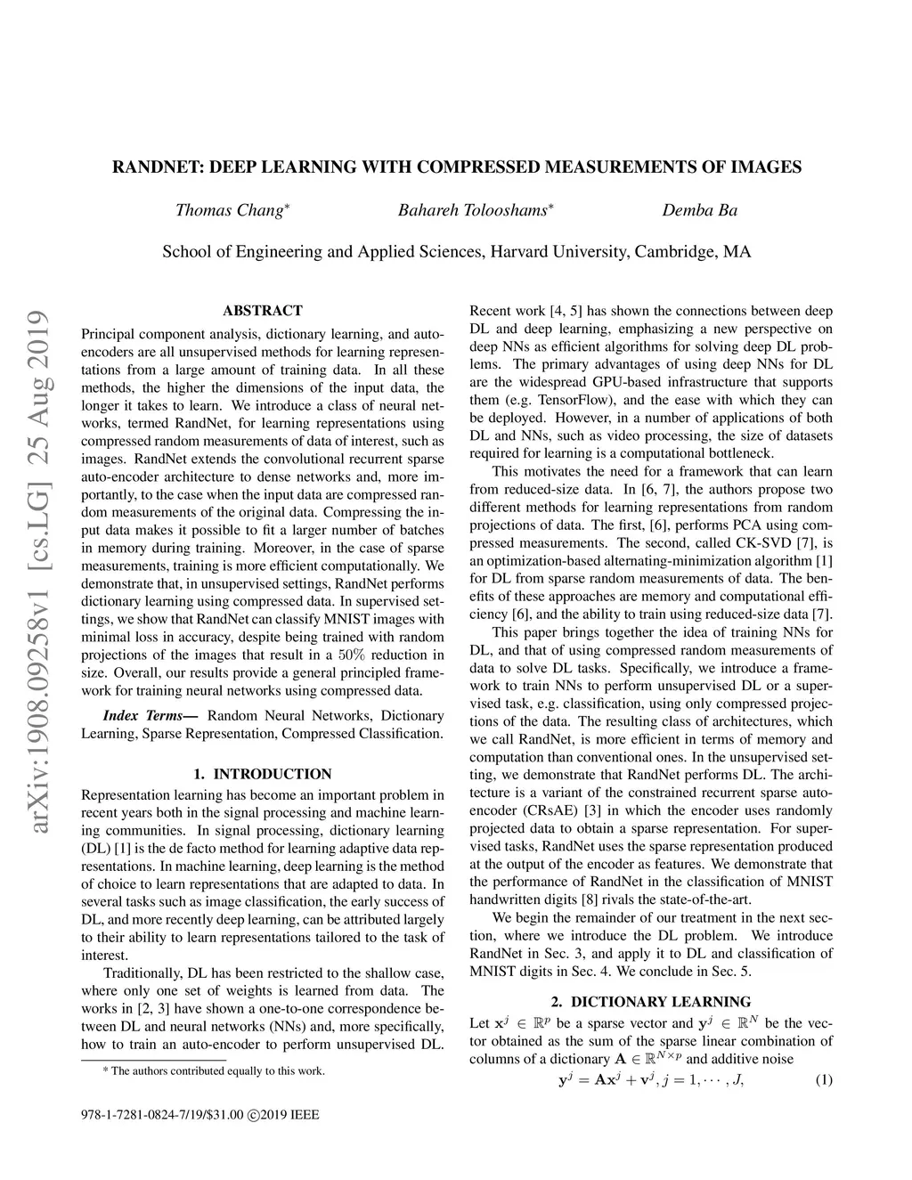 Principal component analysis, dictionary learning, and auto-encoders are all unsupervised methods for learning representations from a large amount of training data. In all these methods, the higher the dimensions of the input data, the longer it takes to learn. We introduce a class of neural networks, termed RandNet, for learning representations using compressed random measurements of data of interest, such as images. RandNet extends the convolutional recurrent sparse auto-encoder architecture to dense networks and, more importantly, to the case when the input data are compressed random measurements of the original data. Compressing the input data makes it possible to fit a larger number of batches in memory during training. Moreover, in the case of sparse measurements,training is more efficient computationally. We demonstrate that, in unsupervised settings, RandNet performs dictionary learning using compressed data. In supervised settings, we show that RandNet can classify MNIST images with minimal loss in accuracy, despite being trained with random projections of the images that result in a 50% reduction in size. Overall, our results provide a general principled framework for training neural networks using compressed data.