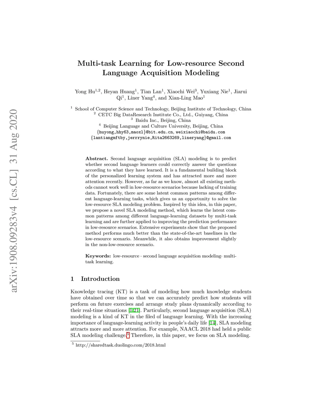 Second language acquisition (SLA) modeling is to predict whether second language learners could correctly answer the questions according to what they have learned. It is a fundamental building block of the personalized learning system and has attracted more and more attention recently. However, as far as we know, almost all existing methods cannot work well in low-resource scenarios due to lacking of training data. Fortunately, there are some latent common patterns among different language-learning tasks, which gives us an opportunity to solve the low-resource SLA modeling problem. Inspired by this idea, in this paper, we propose a novel SLA modeling method, which learns the latent common patterns among different language-learning datasets by multi-task learning and are further applied to improving the prediction performance in low-resource scenarios. Extensive experiments show that the proposed method performs much better than the state-of-the-art baselines in the low-resource scenario. Meanwhile, it also obtains improvement slightly in the non-low-resource scenario.