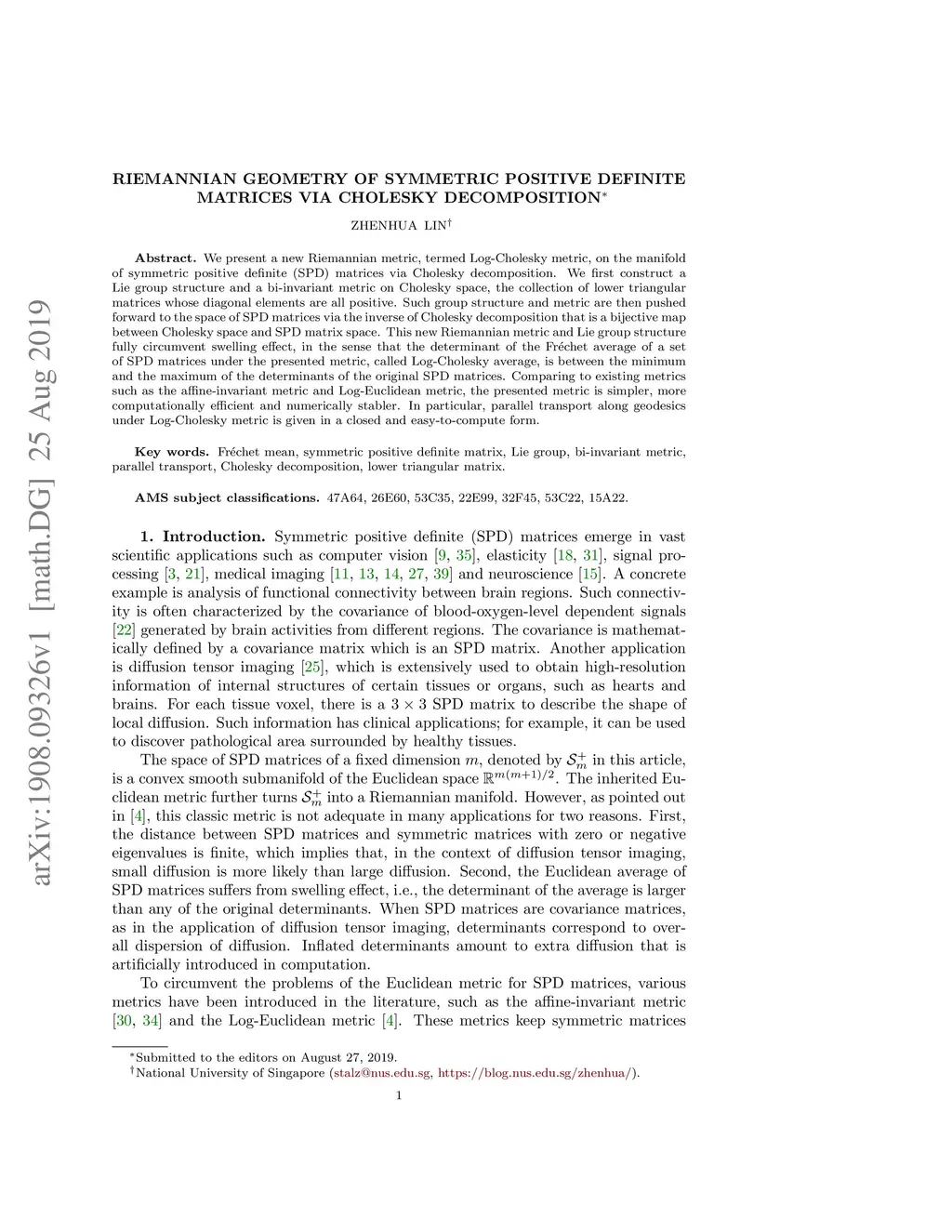 We present a new Riemannian metric, termed Log-Cholesky metric, on the manifold of symmetric positive definite (SPD) matrices via Cholesky decomposition. We first construct a Lie group structure and a bi-invariant metric on Cholesky space, the collection of lower triangular matrices whose diagonal elements are all positive. Such group structure and metric are then pushed forward to the space of SPD matrices via the inverse of Cholesky decomposition that is a bijective map between Cholesky space and SPD matrix space. This new Riemannian metric and Lie group structure fully circumvent swelling effect, in the sense that the determinant of the Fr\échet average of a set of SPD matrices under the presented metric, called Log-Cholesky average, is between the minimum and the maximum of the determinants of the original SPD matrices. Comparing to existing metrics such as the affine-invariant metric and Log-Euclidean metric, the presented metric is simpler, more computationally efficient and numerically stabler. In particular, parallel transport along geodesics under Log-Cholesky metric is given in a closed and easy-to-compute form.