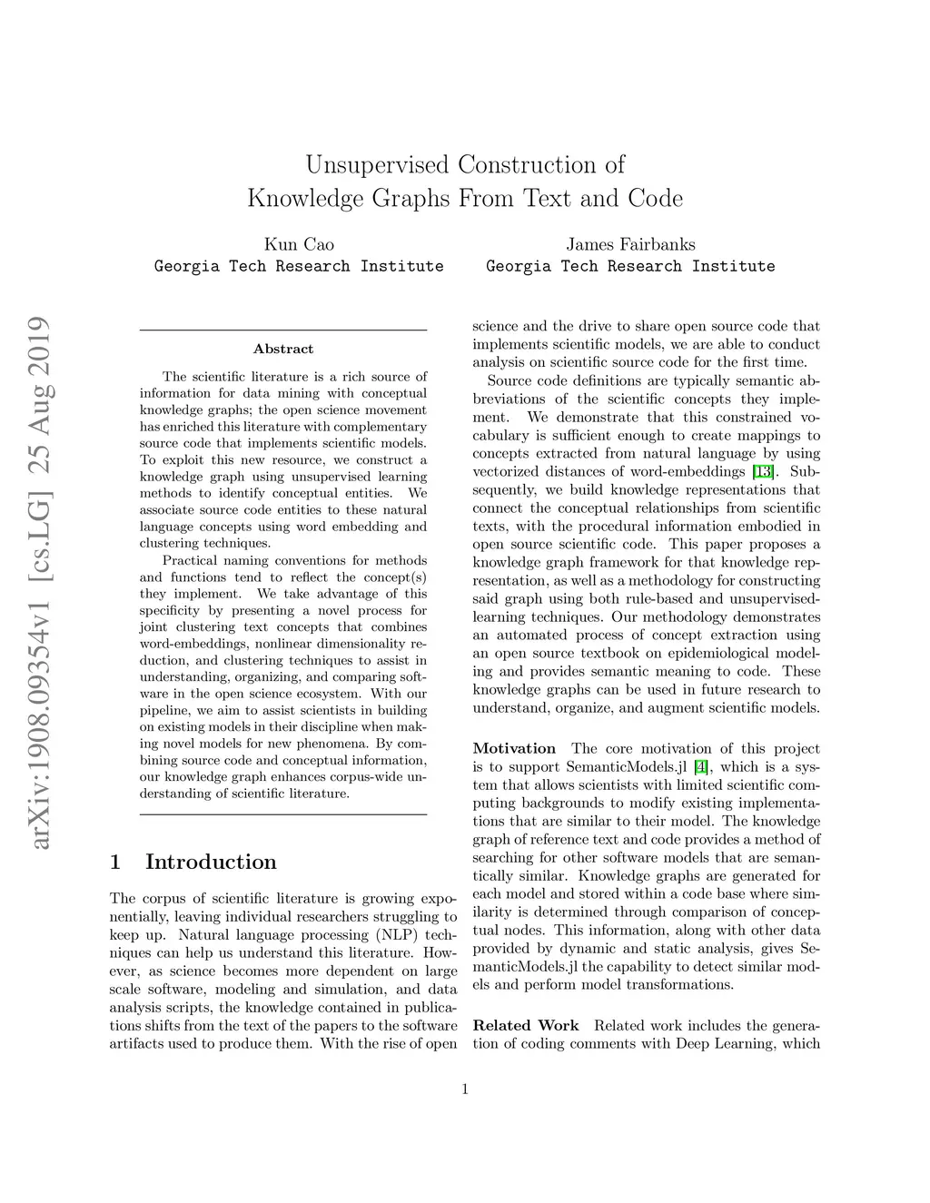 The scientific literature is a rich source of information for data mining with conceptual knowledge graphs; the open science movement has enriched this literature with complementary source code that implements scientific models. To exploit this new resource, we construct a knowledge graph using unsupervised learning methods to identify conceptual entities. We associate source code entities to these natural language concepts using word embedding and clustering techniques. Practical naming conventions for methods and functions tend to reflect the concept(s) they implement. We take advantage of this specificity by presenting a novel process for joint clustering text concepts that combines word-embeddings, nonlinear dimensionality reduction, and clustering techniques to assist in understanding, organizing, and comparing software in the open science ecosystem. With our pipeline, we aim to assist scientists in building on existing models in their discipline when making novel models for new phenomena. By combining source code and conceptual information, our knowledge graph enhances corpus-wide understanding of scientific literature.