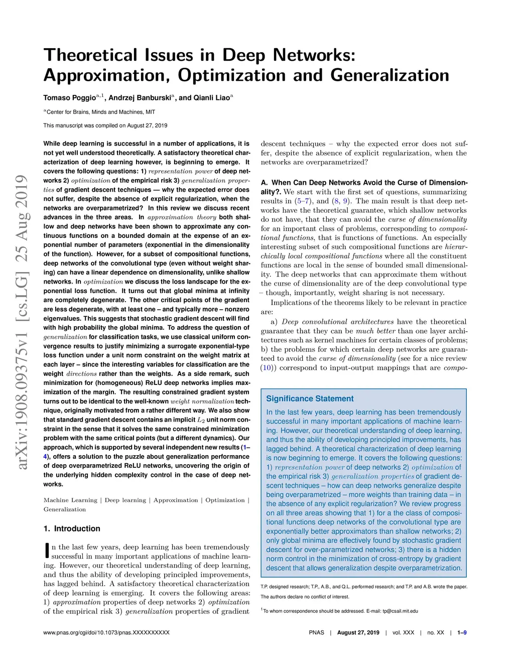 Theoretical Issues in Deep Networks: Approximation, Optimization and