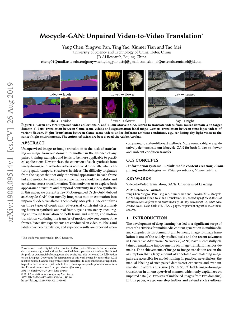 Mocycle-GAN: Unpaired Video-to-Video Translation