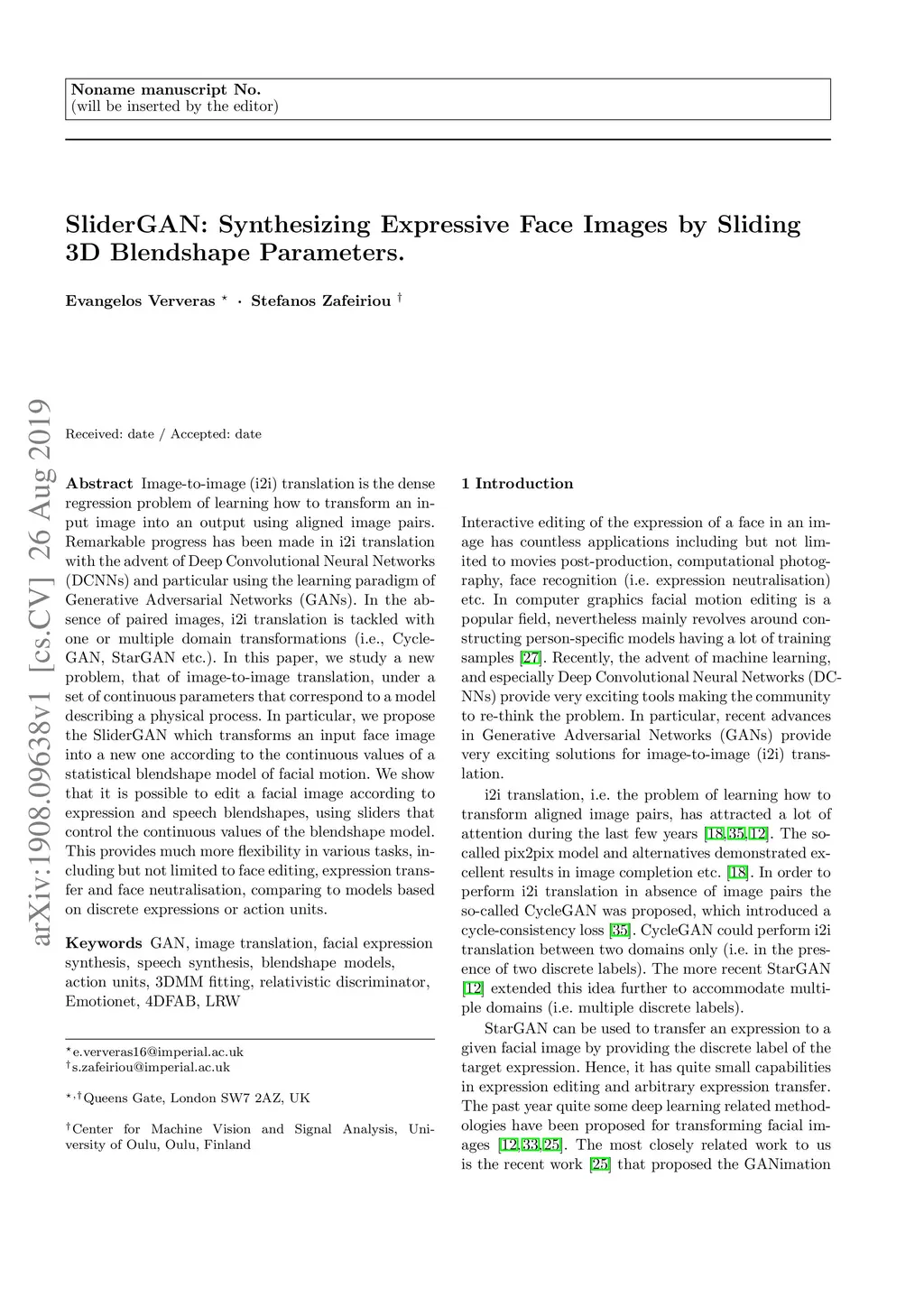 Image-to-image (i2i) translation is the dense regression problem of learning how to transform an input image into an output using aligned image pairs. Remarkable progress has been made in i2i translation with the advent of Deep Convolutional Neural Networks (DCNNs) and particular using the learning paradigm of Generative Adversarial Networks (GANs). In the absence of paired images, i2i translation is tackled with one or multiple domain transformations (i.e., CycleGAN, StarGAN etc.). In this paper, we study a new problem, that of image-to-image translation, under a set of continuous parameters that correspond to a model describing a physical process. In particular, we propose the SliderGAN which transforms an input face image into a new one according to the continuous values of a statistical blendshape model of facial motion. We show that it is possible to edit a facial image according to expression and speech blendshapes, using sliders that control the continuous values of the blendshape model. This provides much more flexibility in various tasks, including but not limited to face editing, expression transfer and face neutralisation, comparing to models based on discrete expressions or action units.