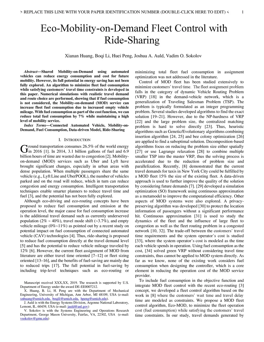 Shared Mobility-on-Demand using automated vehicles can reduce energy consumption and cost for future mobility. However, its full potential in energy saving has not been fully explored. An algorithm to minimize fleet fuel consumption while satisfying customers travel time constraints is developed in this paper. Numerical simulations with realistic travel demand and route choice are performed, showing that if fuel consumption is not considered, the MOD service can increase fleet fuel consumption due to increased empty vehicle mileage. With fuel consumption as part of the cost function, we can reduce total fuel consumption by 7 percent while maintaining a high level of mobility service.