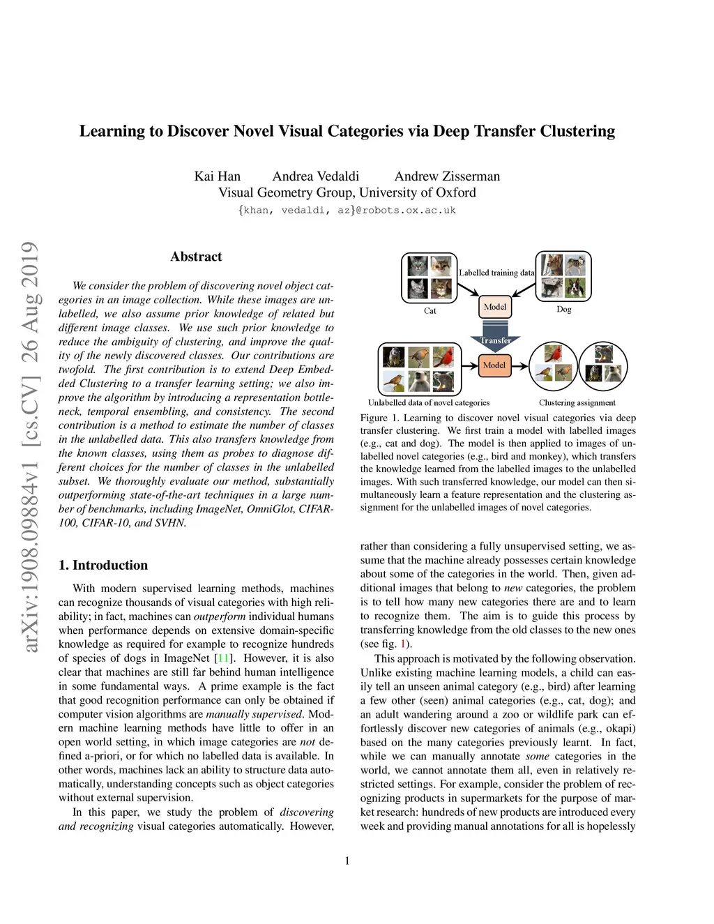 We consider the problem of discovering novel object categories in an image collection. While these images are unlabelled, we also assume prior knowledge of related but different image classes. We use such prior knowledge to reduce the ambiguity of clustering, and improve the quality of the newly discovered classes. Our contributions are twofold. The first contribution is to extend Deep Embedded Clustering to a transfer learning setting; we also improve the algorithm by introducing a representation bottleneck, temporal ensembling, and consistency. The second contribution is a method to estimate the number of classes in the unlabelled data. This also transfers knowledge from the known classes, using them as probes to diagnose different choices for the number of classes in the unlabelled subset. We thoroughly evaluate our method, substantially outperforming state-of-the-art techniques in a large number of benchmarks, including ImageNet, OmniGlot, CIFAR-100, CIFAR-10, and SVHN.