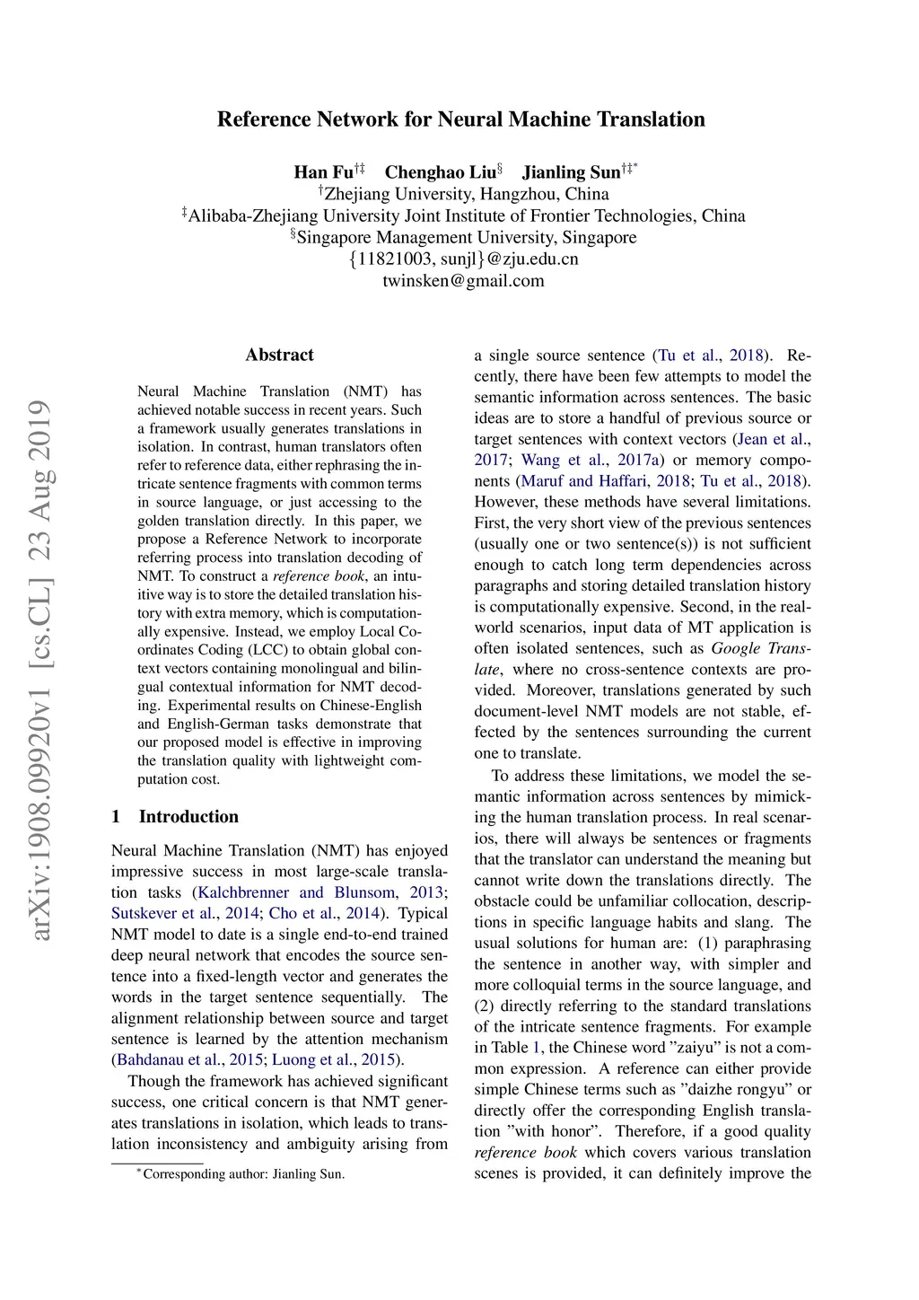 Neural Machine Translation (NMT) has achieved notable success in recent years. Such a framework usually generates translations in isolation. In contrast, human translators often refer to reference data, either rephrasing the intricate sentence fragments with common terms in source language, or just accessing to the golden translation directly. In this paper, we propose a Reference Network to incorporate referring process into translation decoding of NMT. To construct a \emph{reference book}, an intuitive way is to store the detailed translation history with extra memory, which is computationally expensive. Instead, we employ Local Coordinates Coding (LCC) to obtain global context vectors containing monolingual and bilingual contextual information for NMT decoding. Experimental results on Chinese-English and English-German tasks demonstrate that our proposed model is effective in improving the translation quality with lightweight computation cost.