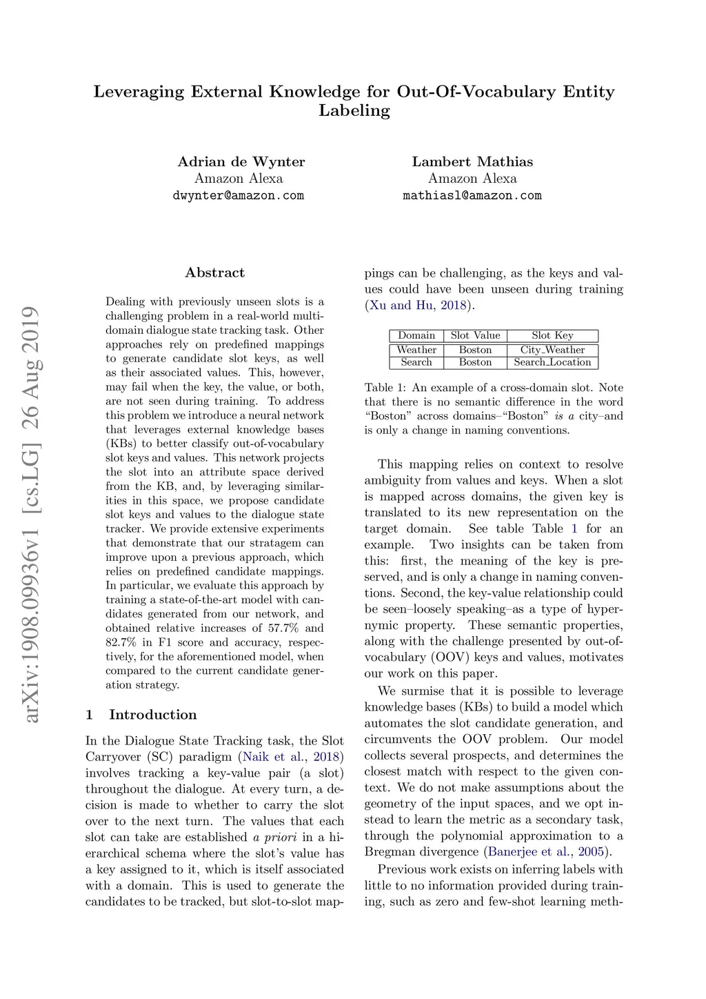 Dealing with previously unseen slots is a challenging problem in a real-world multi-domain dialogue state tracking task. Other approaches rely on predefined mappings to generate candidate slot keys, as well as their associated values. This, however, may fail when the key, the value, or both, are not seen during training. To address this problem we introduce a neural network that leverages external knowledge bases (KBs) to better classify out-of-vocabulary slot keys and values. This network projects the slot into an attribute space derived from the KB, and, by leveraging similarities in this space, we propose candidate slot keys and values to the dialogue state tracker. We provide extensive experiments that demonstrate that our stratagem can improve upon a previous approach, which relies on predefined candidate mappings. In particular, we evaluate this approach by training a state-of-the-art model with candidates generated from our network, and obtained relative increases of 57.7% and 82.7% in F1 score and accuracy, respectively, for the aforementioned model, when compared to the current candidate generation strategy.