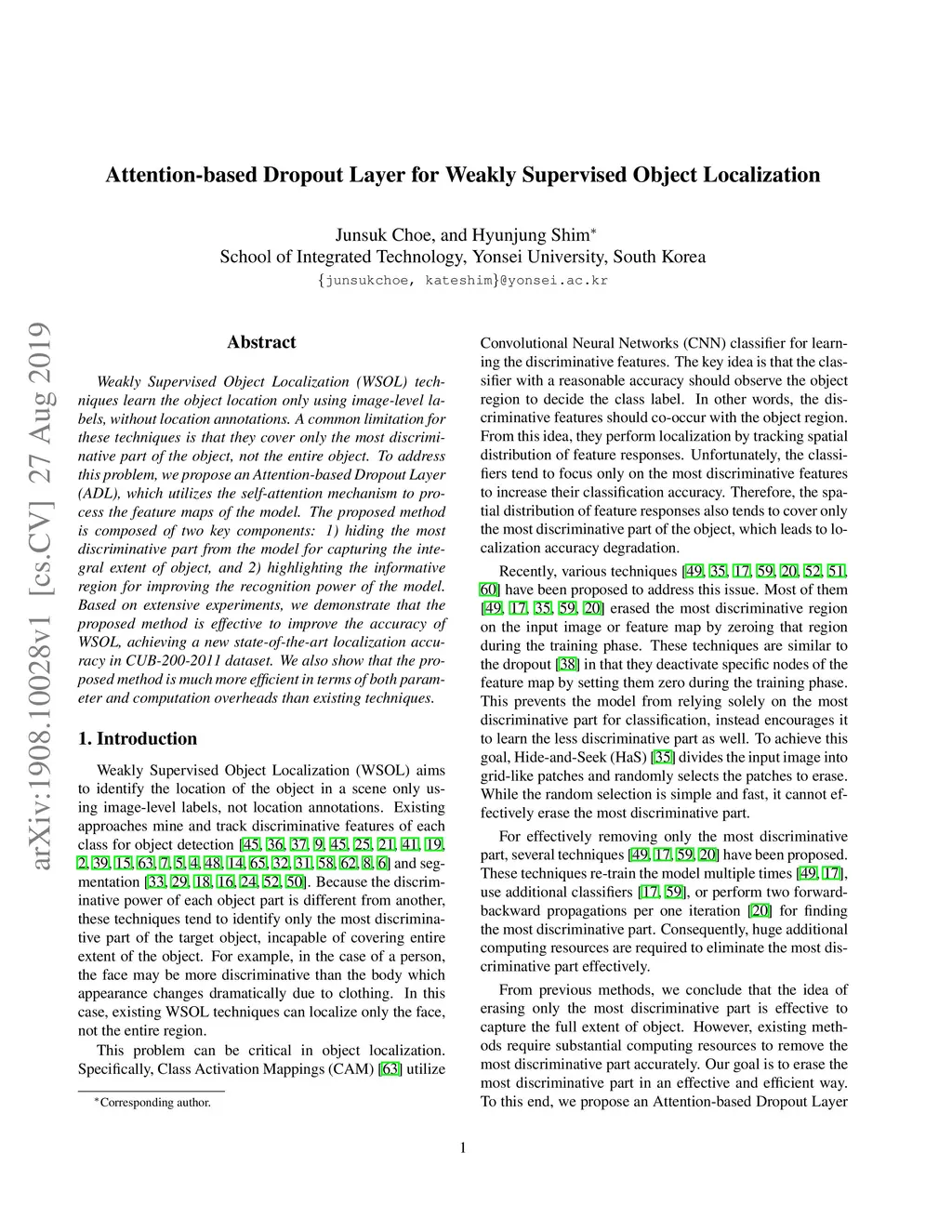 Attention-based Dropout Layer for Weakly Supervised Object Localization