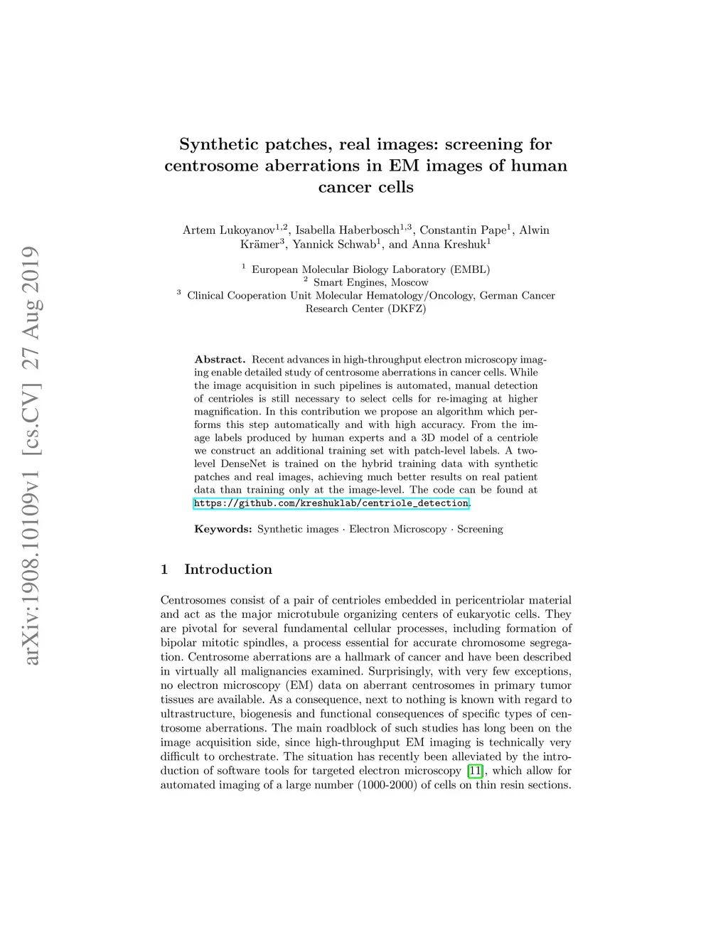 Recent advances in high-throughput electron microscopy imaging enable detailed study of centrosome aberrations in cancer cells. While the image acquisition in such pipelines is automated, manual detection of centrioles is still necessary to select cells for re-imaging at higher magnification. In this contribution we propose an algorithm which performs this step automatically and with high accuracy. From the image labels produced by human experts and a 3D model of a centriole we construct an additional training set with patch-level labels. A two-level DenseNet is trained on the hybrid training data with synthetic patches and real images, achieving much better results on real patient data than training only at the image-level. The code can be found at https://github.com/kreshuklab/centriole_detection.