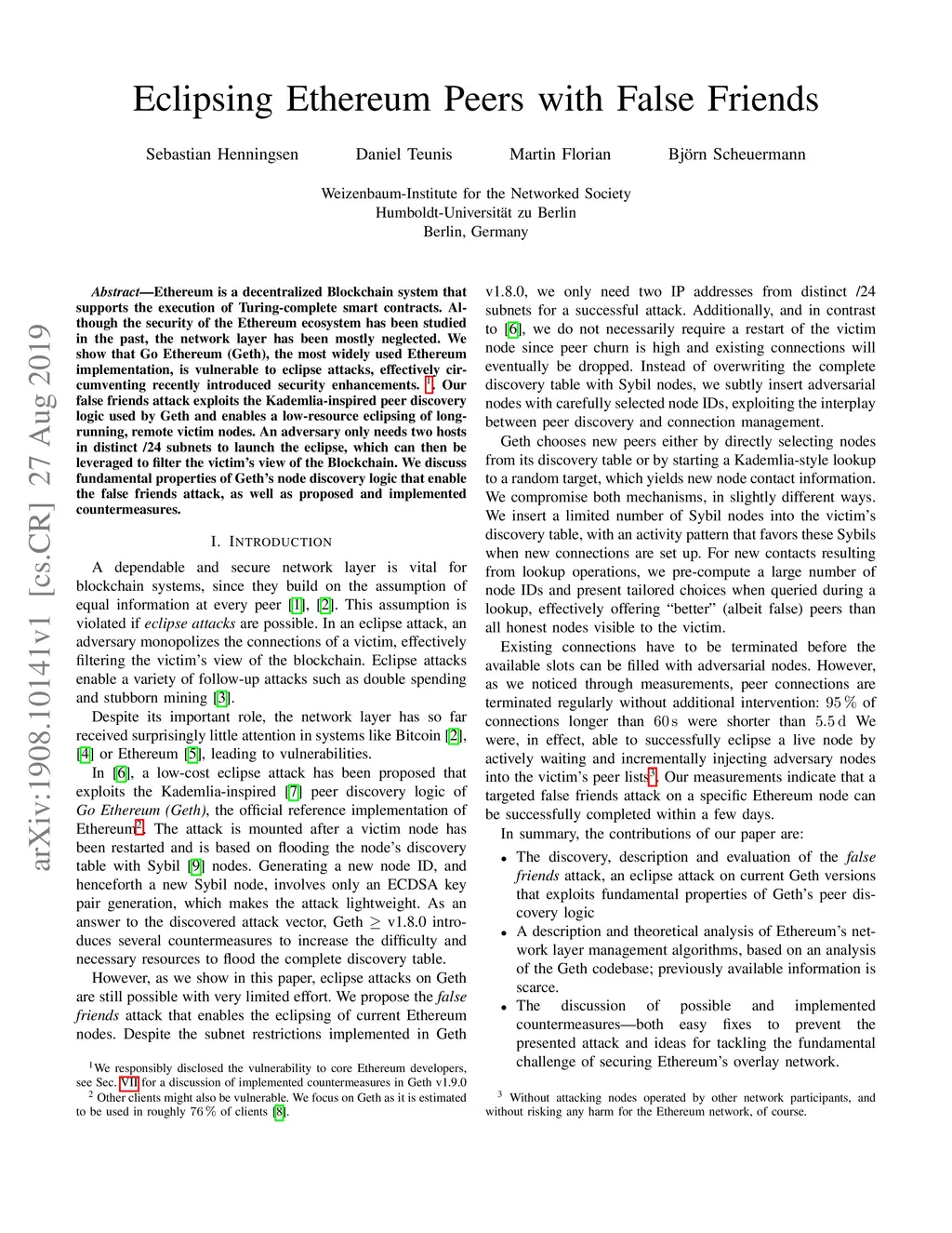 Ethereum is a decentralized Blockchain system that supports the execution of Turing-complete smart contracts. Although the security of the Ethereum ecosystem has been studied in the past, the network layer has been mostly neglected. We show that Go Ethereum (Geth), the most widely used Ethereum implementation, is vulnerable to eclipse attacks, effectively circumventing recently introduced (Geth v1.8.0) security enhancements. We responsibly disclosed the vulnerability to core Ethereum developers; the corresponding countermeasures to our attack where incorporated into the v1.9.0 release of Geth. Our false friends attack exploits the Kademlia-inspired peer discovery logic used by Geth and enables a low-resource eclipsing of long-running, remote victim nodes. An adversary only needs two hosts in distinct /24 subnets to launch the eclipse, which can then be leveraged to filter the victim's view of the Blockchain. We discuss fundamental properties of Geth's node discovery logic that enable the false friends attack, as well as proposed and implemented countermeasures.