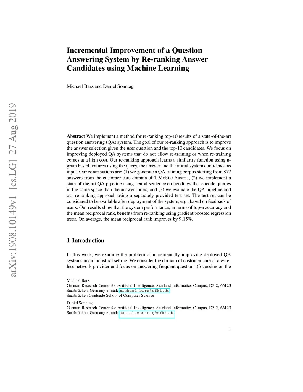Incremental Improvement of a Question Answering System by Re-ranking