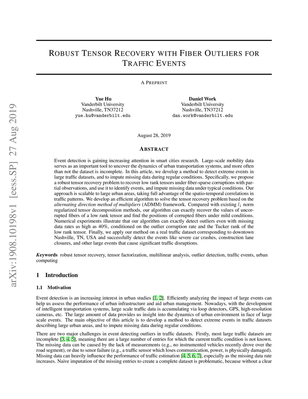 Event detection is gaining increasing attention in smart cities research. Large-scale mobility data serves as an important tool to uncover the dynamics of urban transportation systems, and more often than not the dataset is incomplete. In this article, we develop a method to detect extreme events in large traffic datasets, and to impute missing data during regular conditions. Specifically, we propose a robust tensor recovery problem to recover low rank tensors under fiber-sparse corruptions with partial observations, and use it to identify events, and impute missing data under typical conditions. Our approach is scalable to large urban areas, taking full advantage of the spatio-temporal correlations in traffic patterns. We develop an efficient algorithm to solve the tensor recovery problem based on the alternating direction method of multipliers (ADMM) framework. Compared with existing norm regularized tensor decomposition methods, our algorithm can exactly recover the values of uncorrupted fibers of a low rank tensor and find the positions of corrupted fibers under mild conditions. Numerical experiments illustrate that our algorithm can exactly detect outliers even with missing data rates as high as 40%, conditioned on the outlier corruption rate and the Tucker rank of the low rank tensor. Finally, we apply our method on a real traffic dataset corresponding to downtown Nashville, TN, USA and successfully detect the events like severe car crashes, construction lane closures, and other large events that cause significant traffic disruptions.