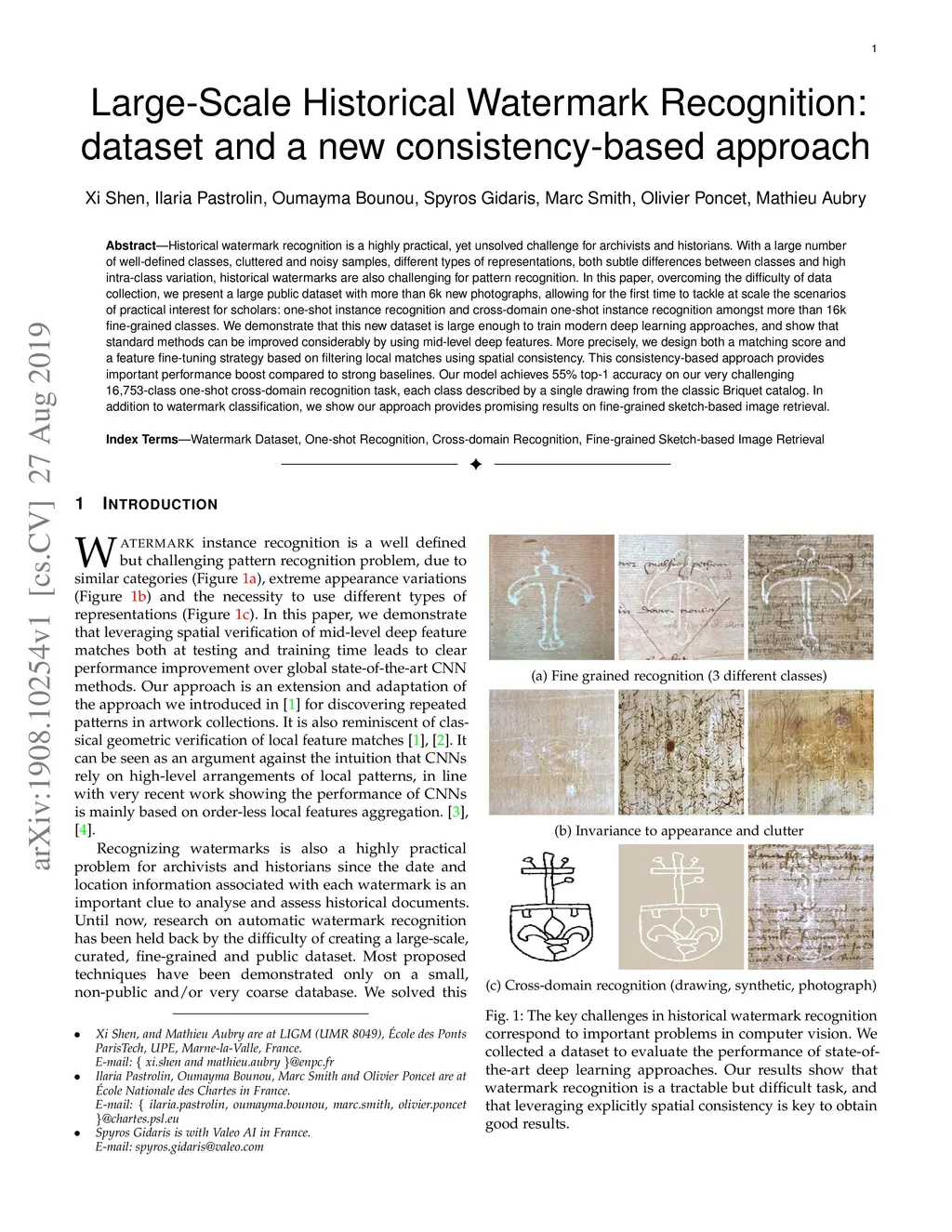 Historical watermark recognition is a highly practical, yet unsolved challenge for archivists and historians. With a large number of well-defined classes, cluttered and noisy samples, different types of representations, both subtle differences between classes and high intra-class variation, historical watermarks are also challenging for pattern recognition. In this paper, overcoming the difficulty of data collection, we present a large public dataset with more than 6k new photographs, allowing for the first time to tackle at scale the scenarios of practical interest for scholars: one-shot instance recognition and cross-domain one-shot instance recognition amongst more than 16k fine-grained classes. We demonstrate that this new dataset is large enough to train modern deep learning approaches, and show that standard methods can be improved considerably by using mid-level deep features. More precisely, we design both a matching score and a feature fine-tuning strategy based on filtering local matches using spatial consistency. This consistency-based approach provides important performance boost compared to strong baselines. Our model achieves 55% top-1 accuracy on our very challenging 16,753-class one-shot cross-domain recognition task, each class described by a single drawing from the classic Briquet catalog. In addition to watermark classification, we show our approach provides promising results on fine-grained sketch-based image retrieval.