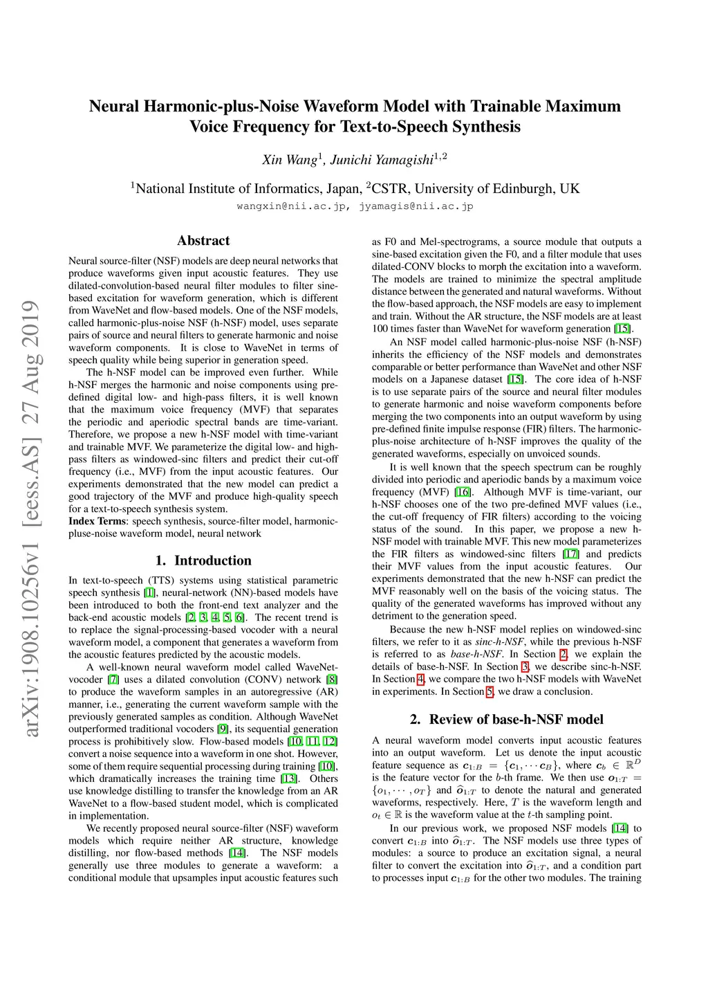Neural source-filter (NSF) models are deep neural networks that produce waveforms given input acoustic features. They use dilated-convolution-based neural filter modules to filter sine-based excitation for waveform generation, which is different from WaveNet and flow-based models. One of the NSF models, called harmonic-plus-noise NSF (h-NSF) model, uses separate pairs of source and neural filters to generate harmonic and noise waveform components. It is close to WaveNet in terms of speech quality while being superior in generation speed. The h-NSF model can be improved even further. While h-NSF merges the harmonic and noise components using pre-defined digital low- and high-pass filters, it is well known that the maximum voice frequency (MVF) that separates the periodic and aperiodic spectral bands are time-variant. Therefore, we propose a new h-NSF model with time-variant and trainable MVF. We parameterize the digital low- and high-pass filters as windowed-sinc filters and predict their cut-off frequency (i.e., MVF) from the input acoustic features. Our experiments demonstrated that the new model can predict a good trajectory of the MVF and produce high-quality speech for a text-to-speech synthesis system.