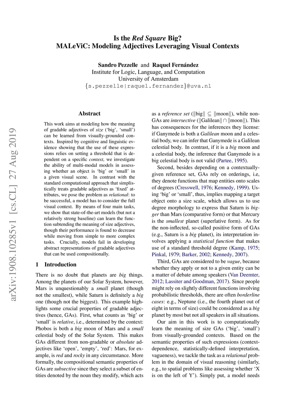 Is the Red Square Big? MALeViC: Modeling Adjectives Leveraging Visual