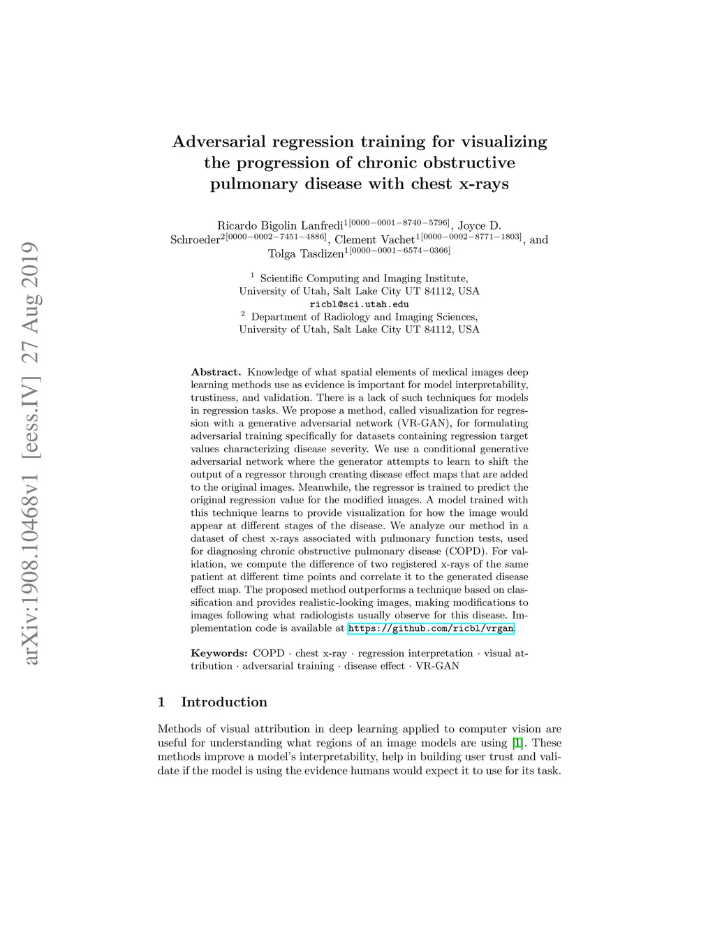 Knowledge of what spatial elements of medical images deep learning methods use as evidence is important for model interpretability, trustiness, and validation. There is a lack of such techniques for models in regression tasks. We propose a method, called visualization for regression with a generative adversarial network (VR-GAN), for formulating adversarial training specifically for datasets containing regression target values characterizing disease severity. We use a conditional generative adversarial network where the generator attempts to learn to shift the output of a regressor through creating disease effect maps that are added to the original images. Meanwhile, the regressor is trained to predict the original regression value for the modified images. A model trained with this technique learns to provide visualization for how the image would appear at different stages of the disease. We analyze our method in a dataset of chest x-rays associated with pulmonary function tests, used for diagnosing chronic obstructive pulmonary disease (COPD). For validation, we compute the difference of two registered x-rays of the same patient at different time points and correlate it to the generated disease effect map. The proposed method outperforms a technique based on classification and provides realistic-looking images, making modifications to images following what radiologists usually observe for this disease. Implementation code is available at https://github.com/ricbl/vrgan.