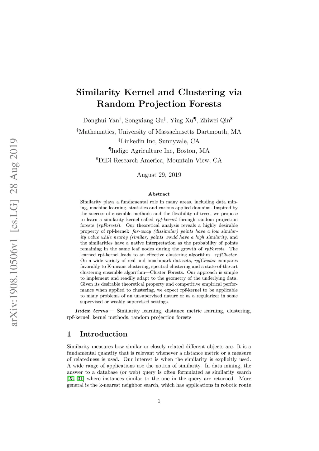 Similarity plays a fundamental role in many areas, including data mining, machine learning, statistics and various applied domains. Inspired by the success of ensemble methods and the flexibility of trees, we propose to learn a similarity kernel called rpf-kernel through random projection forests (rpForests). Our theoretical analysis reveals a highly desirable property of rpf-kernel: far-away (dissimilar) points have a low similarity value while nearby (similar) points would have a high similarity}, and the similarities have a native interpretation as the probability of points remaining in the same leaf nodes during the growth of rpForests. The learned rpf-kernel leads to an effective clustering algorithm--rpfCluster. On a wide variety of real and benchmark datasets, rpfCluster compares favorably to K-means clustering, spectral clustering and a state-of-the-art clustering ensemble algorithm--Cluster Forests. Our approach is simple to implement and readily adapt to the geometry of the underlying data. Given its desirable theoretical property and competitive empirical performance when applied to clustering, we expect rpf-kernel to be applicable to many problems of an unsupervised nature or as a regularizer in some supervised or weakly supervised settings.