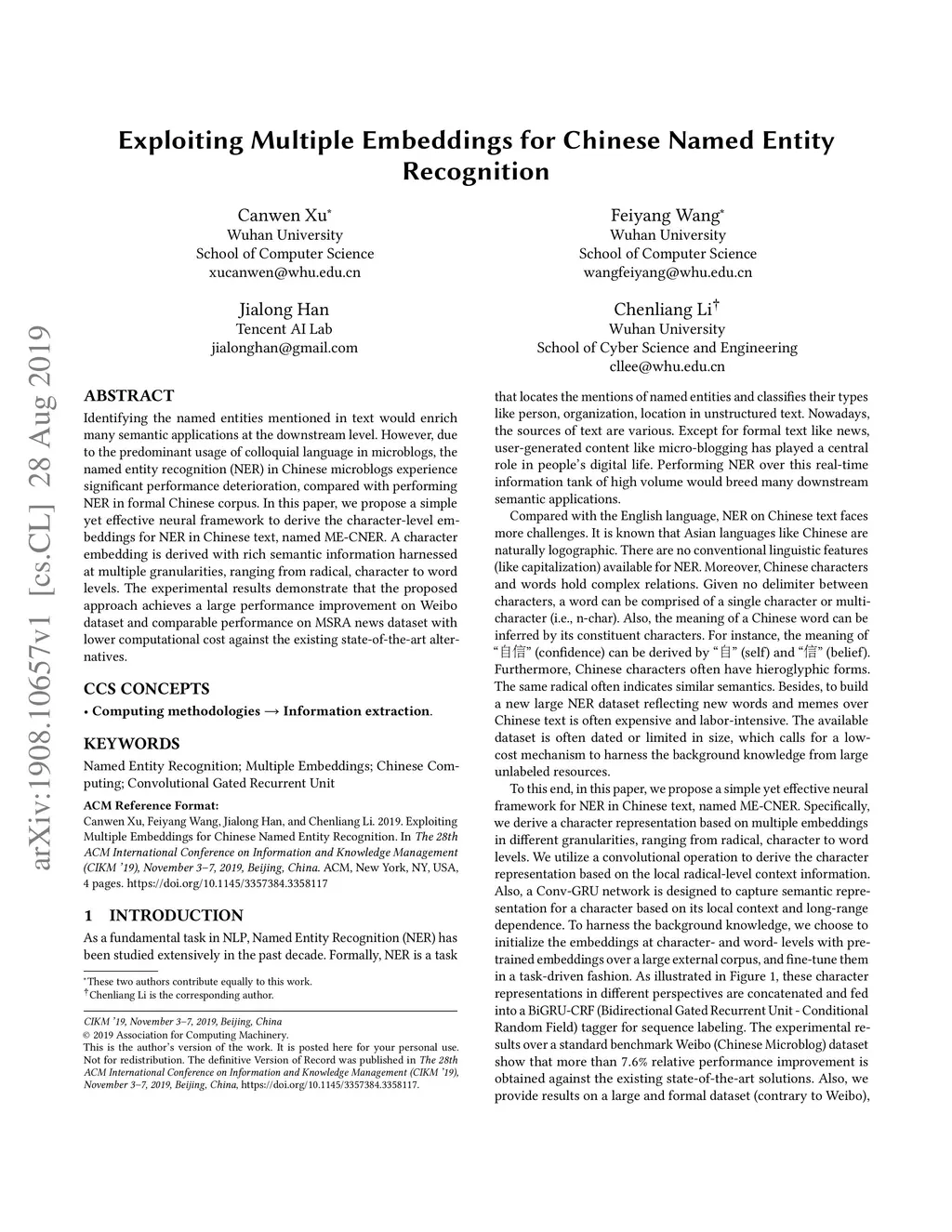 Exploiting Multiple Embeddings for Chinese Named Entity Recognition