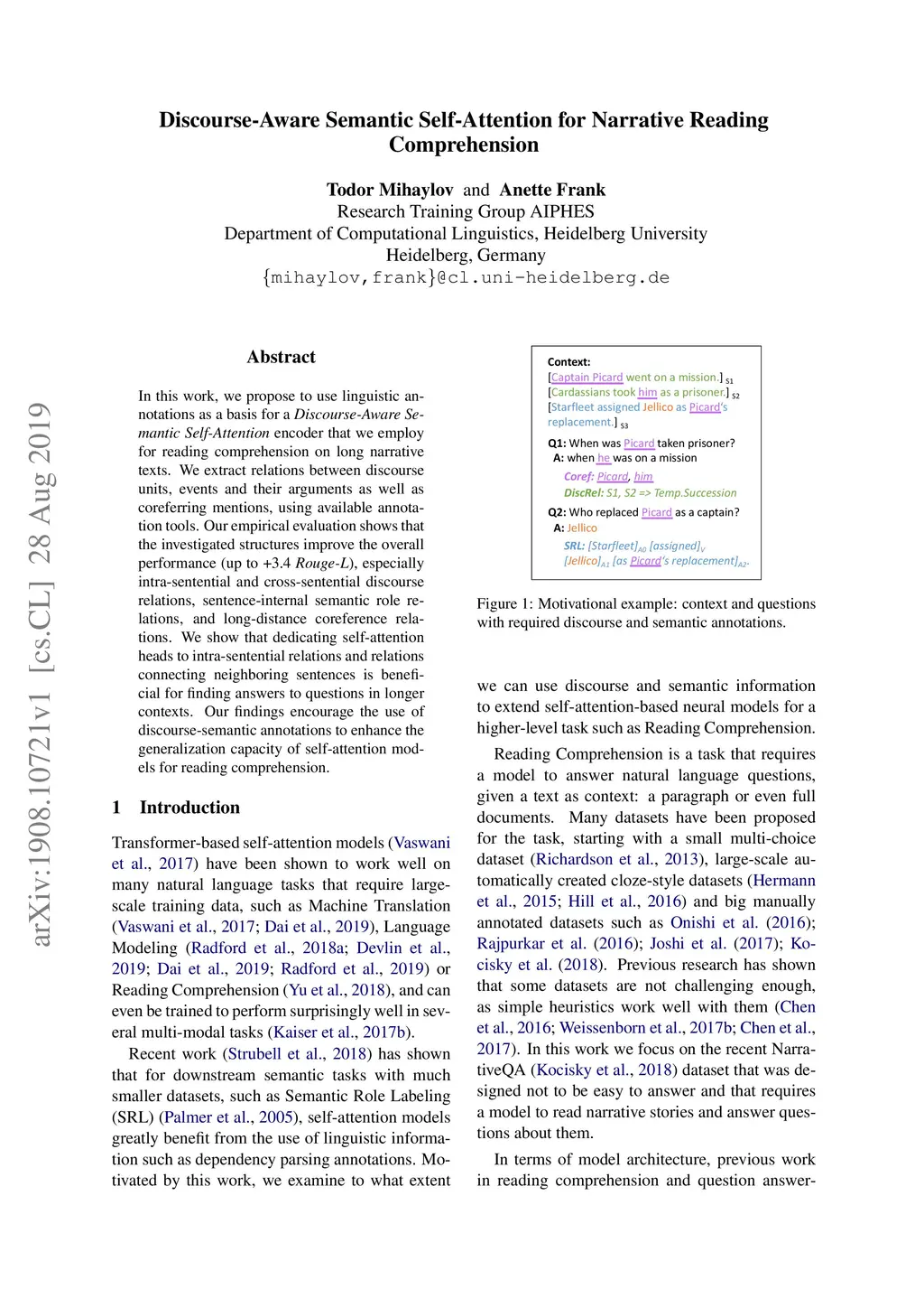 Discourse-Aware Semantic Self-Attention for Narrative Reading