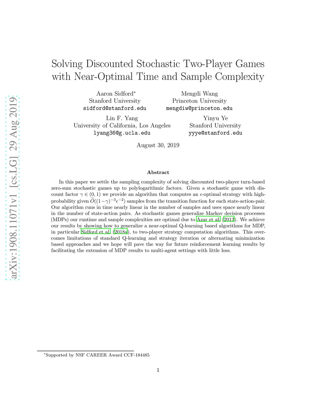 In this paper, we settle the sampling complexity of solving discounted two-player turn-based zero-sum stochastic games up to polylogarithmic factors. Given a stochastic game with discount factor we provide an algorithm that computes an -optimal strategy with high-probability given samples from the transition function for each state-action-pair. Our algorithm runs in time nearly linear in the number of samples and uses space nearly linear in the number of state-action pairs. As stochastic games generalize Markov decision processes (MDPs) our runtime and sample complexities are optimal due to Azar et al (2013). We achieve our results by showing how to generalize a near-optimal Q-learning based algorithms for MDP, in particular Sidford et al (2018), to two-player strategy computation algorithms. This overcomes limitations of standard Q-learning and strategy iteration or alternating minimization based approaches and we hope will pave the way for future reinforcement learning results by facilitating the extension of MDP results to multi-agent settings with little loss.