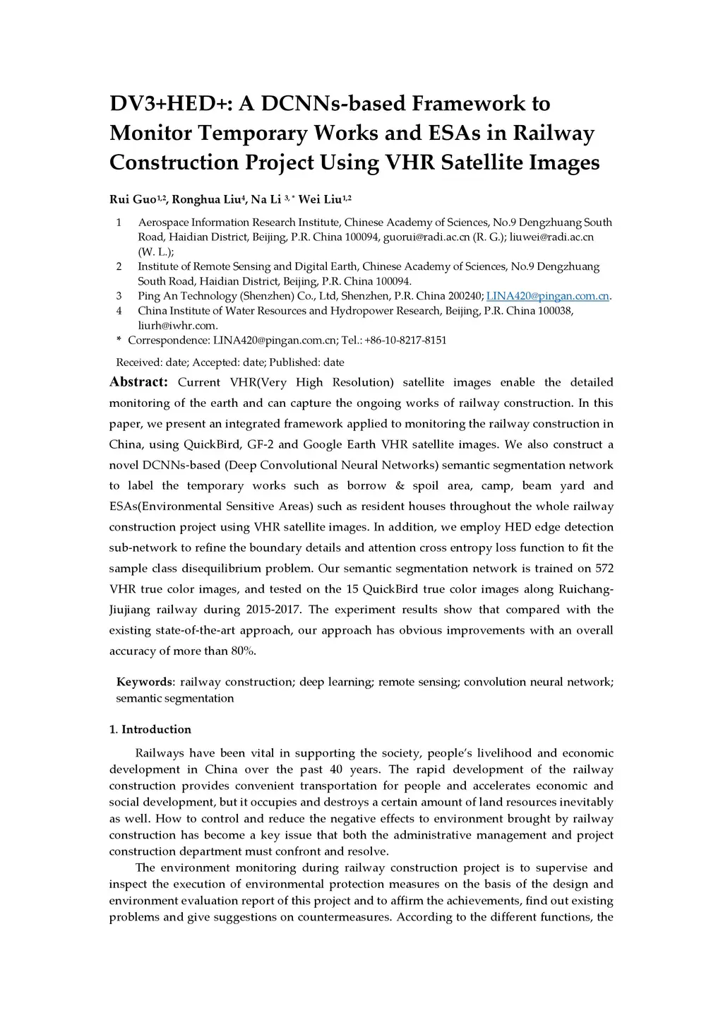 Current VHR(Very High Resolution) satellite images enable the detailed monitoring of the earth and can capture the ongoing works of railway construction. In this paper, we present an integrated framework applied to monitoring the railway construction in China, using QuickBird, GF-2 and Google Earth VHR satellite images. We also construct a novel DCNNs-based (Deep Convolutional Neural Networks) semantic segmentation network to label the temporary works such as borrow & spoil area, camp, beam yard and ESAs(Environmental Sensitive Areas) such as resident houses throughout the whole railway construction project using VHR satellite images. In addition, we employ HED edge detection sub-network to refine the boundary details and attention cross entropy loss function to fit the sample class disequilibrium problem. Our semantic segmentation network is trained on 572 VHR true color images, and tested on the 15 QuickBird true color images along Ruichang-Jiujiang railway during 2015-2017. The experiment results show that compared with the existing state-of-the-art approach, our approach has obvious improvements with an overall accuracy of more than 80%.