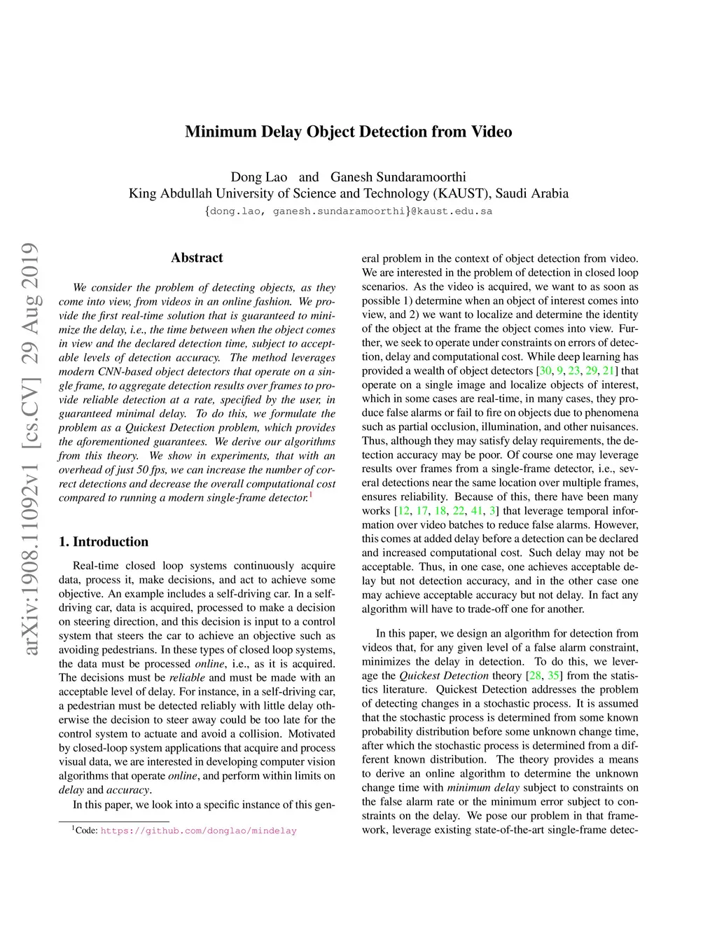 Minimum Delay Object Detection From Video