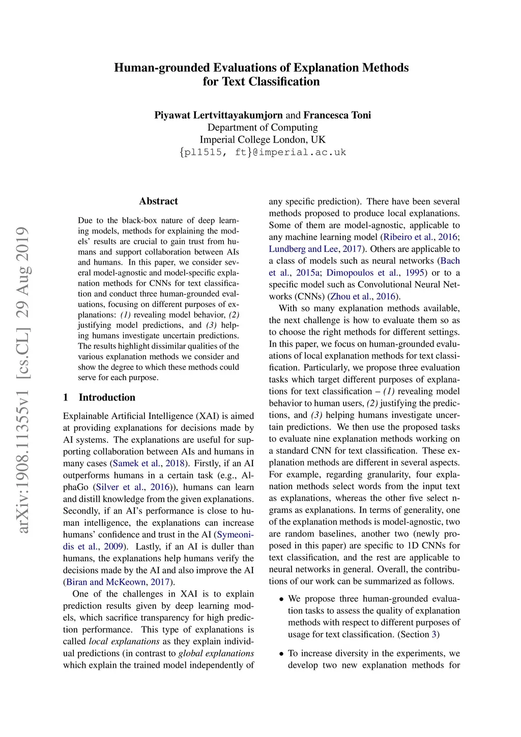 Due to the black-box nature of deep learning models, methods for explaining the models' results are crucial to gain trust from humans and support collaboration between AIs and humans. In this paper, we consider several model-agnostic and model-specific explanation methods for CNNs for text classification and conduct three human-grounded evaluations, focusing on different purposes of explanations: (1) revealing model behavior, (2) justifying model predictions, and (3) helping humans investigate uncertain predictions. The results highlight dissimilar qualities of the various explanation methods we consider and show the degree to which these methods could serve for each purpose.