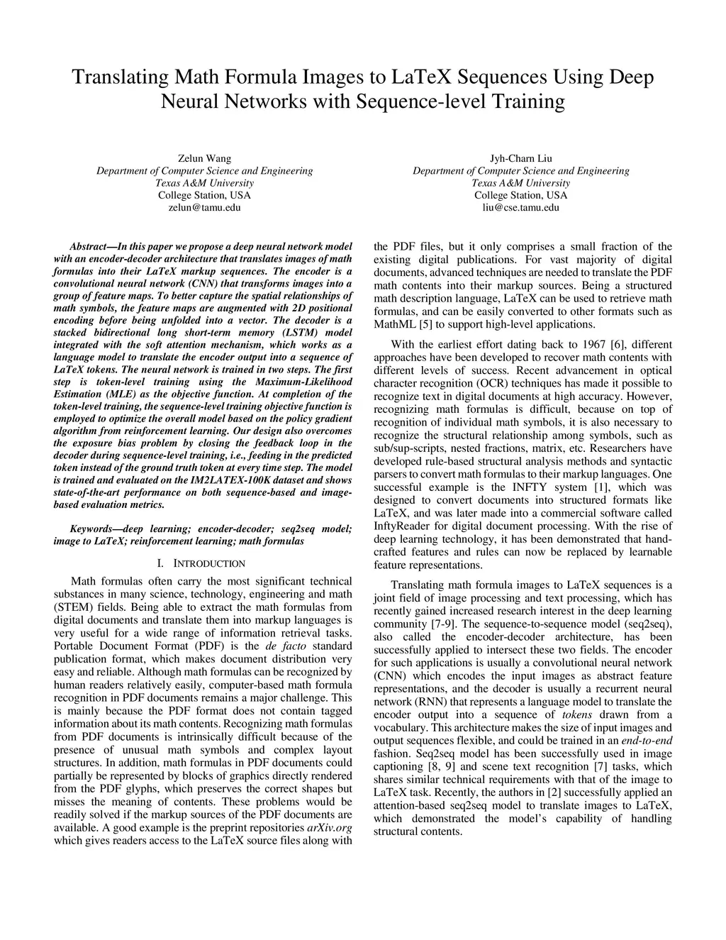 In this paper we propose a deep neural network model with an encoder-decoder architecture that translates images of math formulas into their LaTeX markup sequences. The encoder is a convolutional neural network (CNN) that transforms images into a group of feature maps. To better capture the spatial relationships of math symbols, the feature maps are augmented with 2D positional encoding before being unfolded into a vector. The decoder is a stacked bidirectional long short-term memory (LSTM) model integrated with the soft attention mechanism, which works as a language model to translate the encoder output into a sequence of LaTeX tokens. The neural network is trained in two steps. The first step is token-level training using the Maximum-Likelihood Estimation (MLE) as the objective function. At completion of the token-level training, the sequence-level training objective function is employed to optimize the overall model based on the policy gradient algorithm from reinforcement learning. Our design also overcomes the exposure bias problem by closing the feedback loop in the decoder during sequence-level training, i.e., feeding in the predicted token instead of the ground truth token at every time step. The model is trained and evaluated on the IM2LATEX-100K dataset and shows state-of-the-art performance on both sequence-based and image-based evaluation metrics.