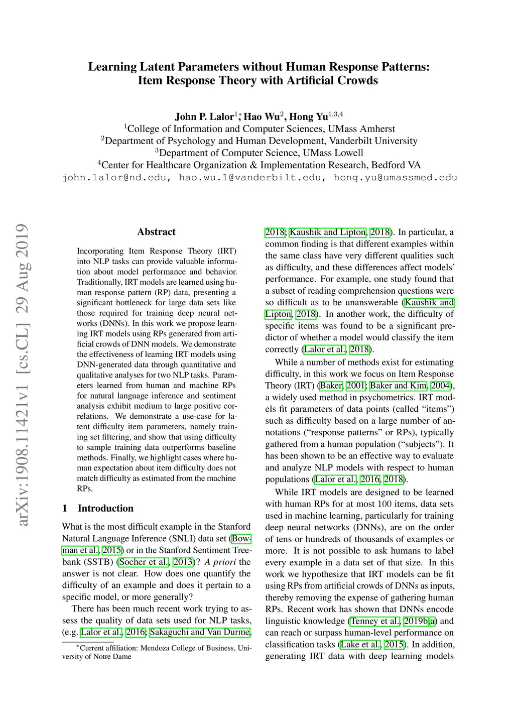Incorporating Item Response Theory (IRT) into NLP tasks can provide valuable information about model performance and behavior. Traditionally, IRT models are learned using human response pattern (RP) data, presenting a significant bottleneck for large data sets like those required for training deep neural networks (DNNs). In this work we propose learning IRT models using RPs generated from artificial crowds of DNN models. We demonstrate the effectiveness of learning IRT models using DNN-generated data through quantitative and qualitative analyses for two NLP tasks. Parameters learned from human and machine RPs for natural language inference and sentiment analysis exhibit medium to large positive correlations. We demonstrate a use-case for latent difficulty item parameters, namely training set filtering, and show that using difficulty to sample training data outperforms baseline methods. Finally, we highlight cases where human expectation about item difficulty does not match difficulty as estimated from the machine RPs.