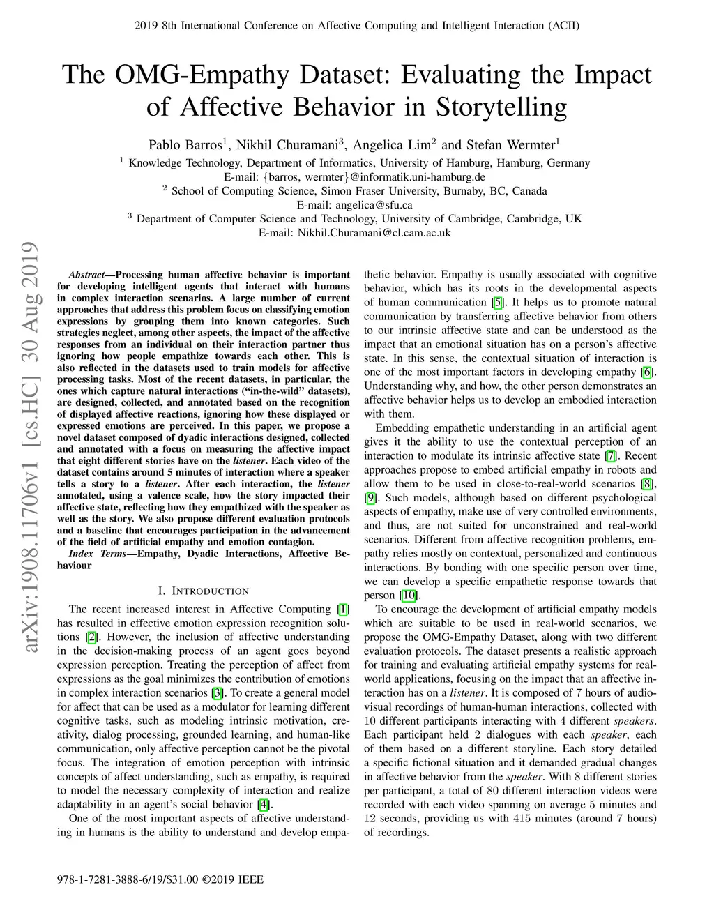 The OMG-Empathy Dataset: Evaluating the Impact of Affective Behavior in