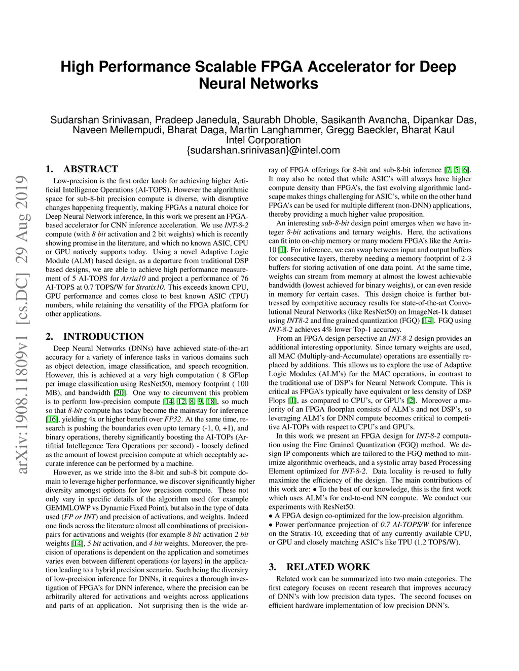 Low-precision is the first order knob for achieving higher Artificial Intelligence Operations (AI-TOPS). However the algorithmic space for sub-8-bit precision compute is diverse, with disruptive changes happening frequently, making FPGAs a natural choice for Deep Neural Network inference, In this work we present an FPGA-based accelerator for CNN inference acceleration. We use {\it INT-8-2} compute (with {\it 8 bit} activation and {2 bit} weights) which is recently showing promise in the literature, and which no known ASIC, CPU or GPU natively supports today. Using a novel Adaptive Logic Module (ALM) based design, as a departure from traditional DSP based designs, we are able to achieve high performance measurement of 5 AI-TOPS for {\it Arria10} and project a performance of 76 AI-TOPS at 0.7 TOPS/W for {\it Stratix10}. This exceeds known CPU, GPU performance and comes close to best known ASIC (TPU) numbers, while retaining the versatility of the FPGA platform for other applications.