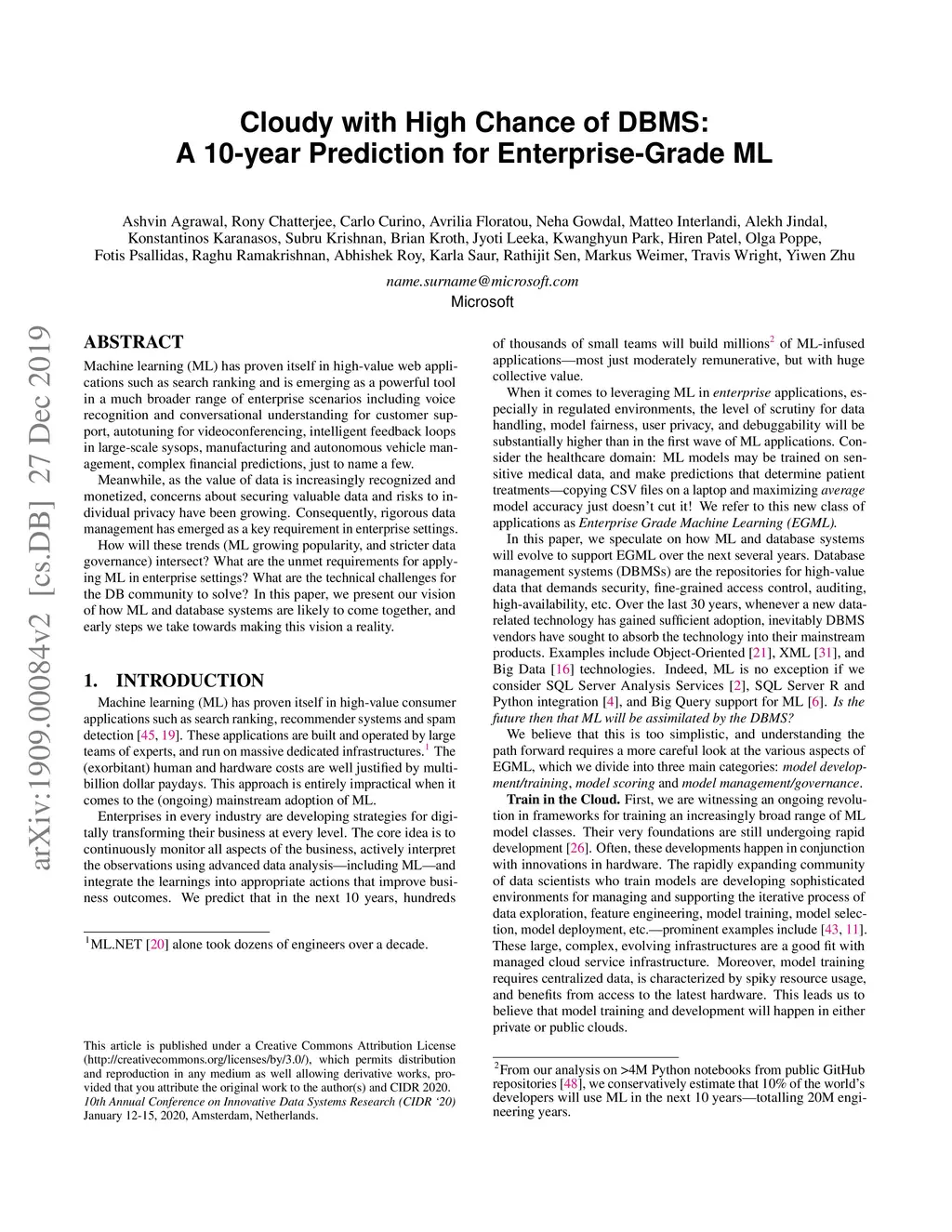 Machine learning (ML) has proven itself in high-value web applications such as search ranking and is emerging as a powerful tool in a much broader range of enterprise scenarios including voice recognition and conversational understanding for customer support, autotuning for videoconferencing, intelligent feedback loops in large-scale sysops, manufacturing and autonomous vehicle management, complex financial predictions, just to name a few. Meanwhile, as the value of data is increasingly recognized and monetized, concerns about securing valuable data and risks to individual privacy have been growing. Consequently, rigorous data management has emerged as a key requirement in enterprise settings. How will these trends (ML growing popularity, and stricter data governance) intersect? What are the unmet requirements for applying ML in enterprise settings? What are the technical challenges for the DB community to solve? In this paper, we present our vision of how ML and database systems are likely to come together, and early steps we take towards making this vision a reality.