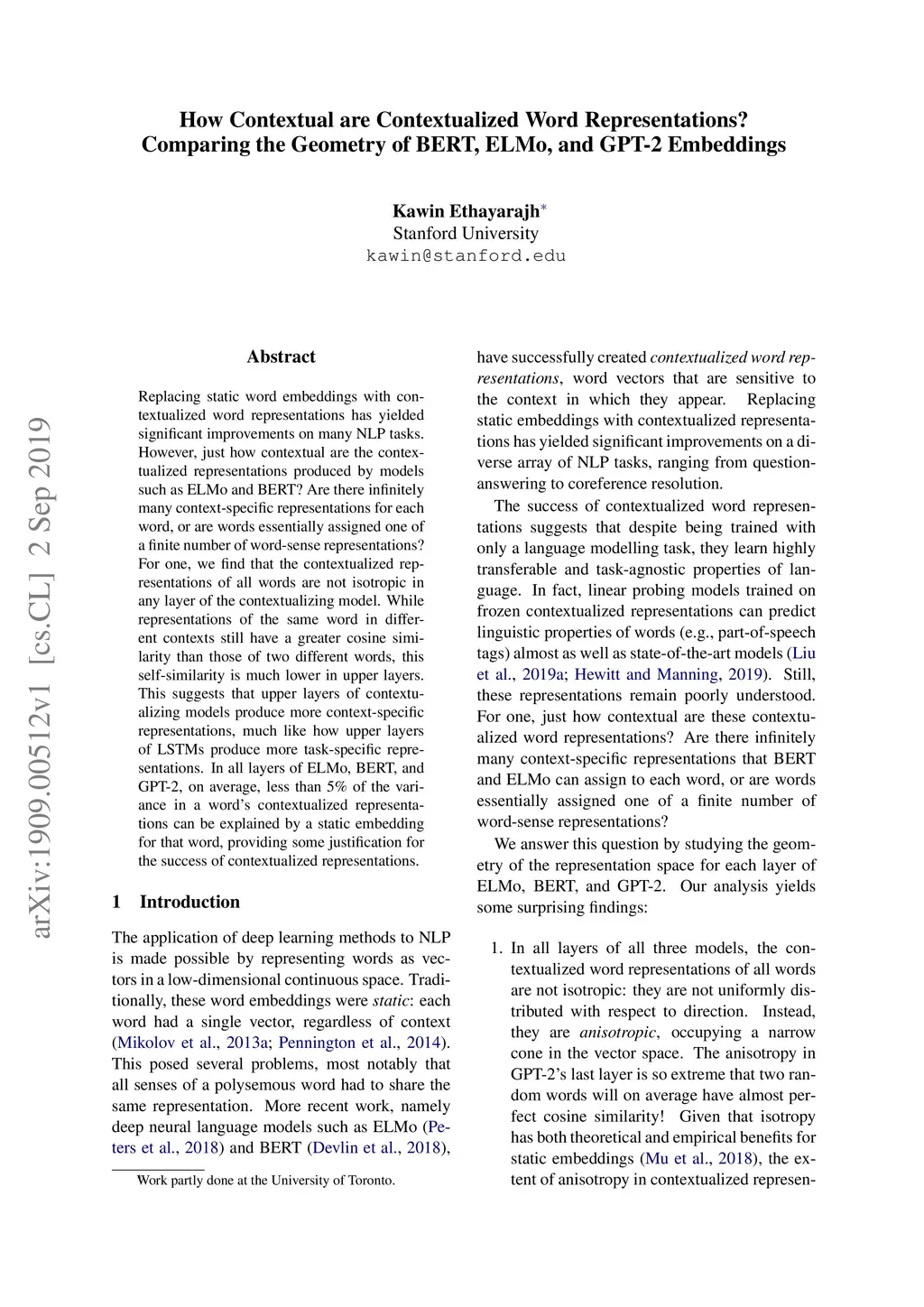 How Contextual are Contextualized Word Representations? Comparing the