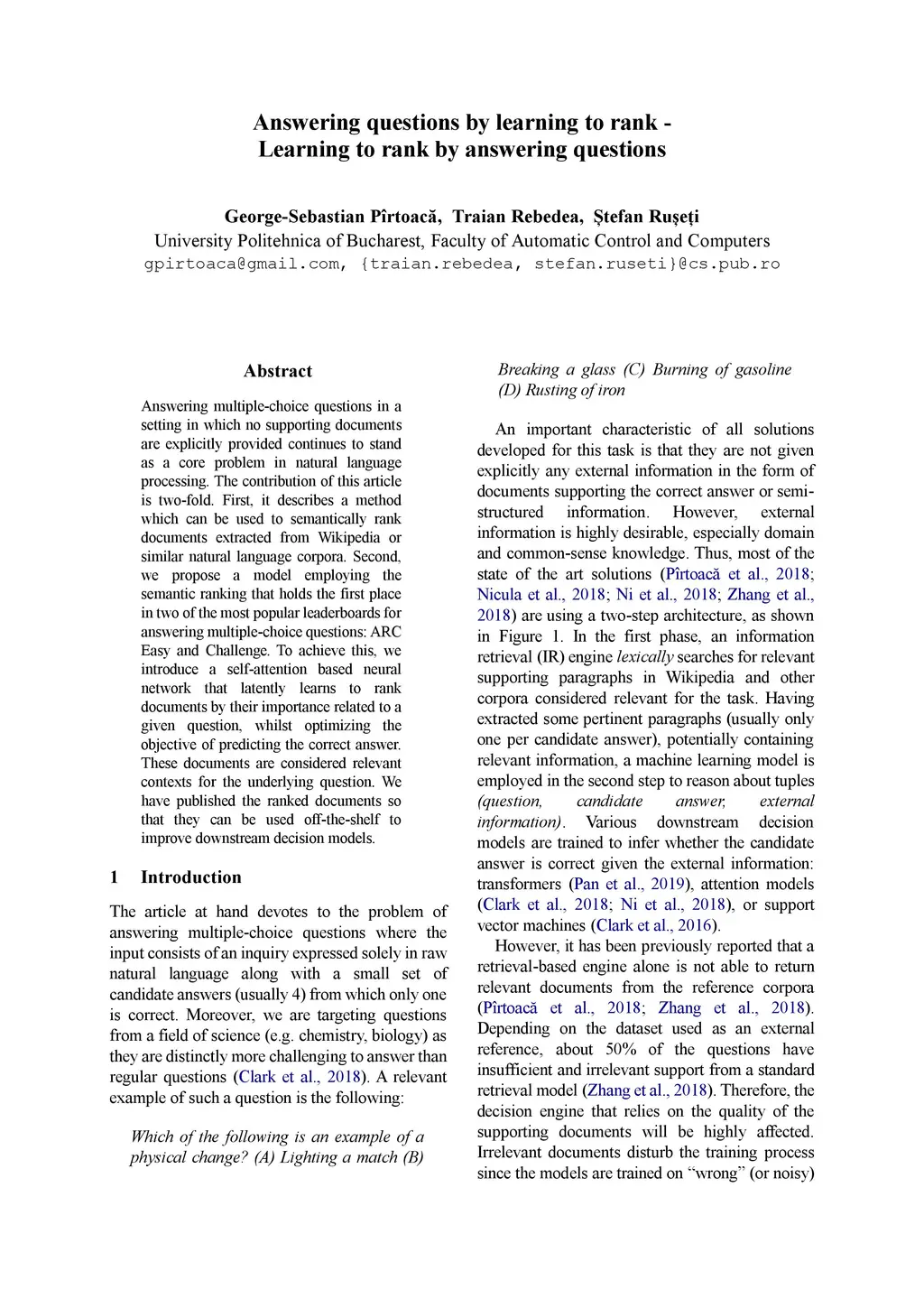 Answering multiple-choice questions in a setting in which no supporting documents are explicitly provided continues to stand as a core problem in natural language processing. The contribution of this article is two-fold. First, it describes a method which can be used to semantically rank documents extracted from Wikipedia or similar natural language corpora. Second, we propose a model employing the semantic ranking that holds the first place in two of the most popular leaderboards for answering multiple-choice questions: ARC Easy and Challenge. To achieve this, we introduce a self-attention based neural network that latently learns to rank documents by their importance related to a given question, whilst optimizing the objective of predicting the correct answer. These documents are considered relevant contexts for the underlying question. We have published the ranked documents so that they can be used off-the-shelf to improve downstream decision models.
