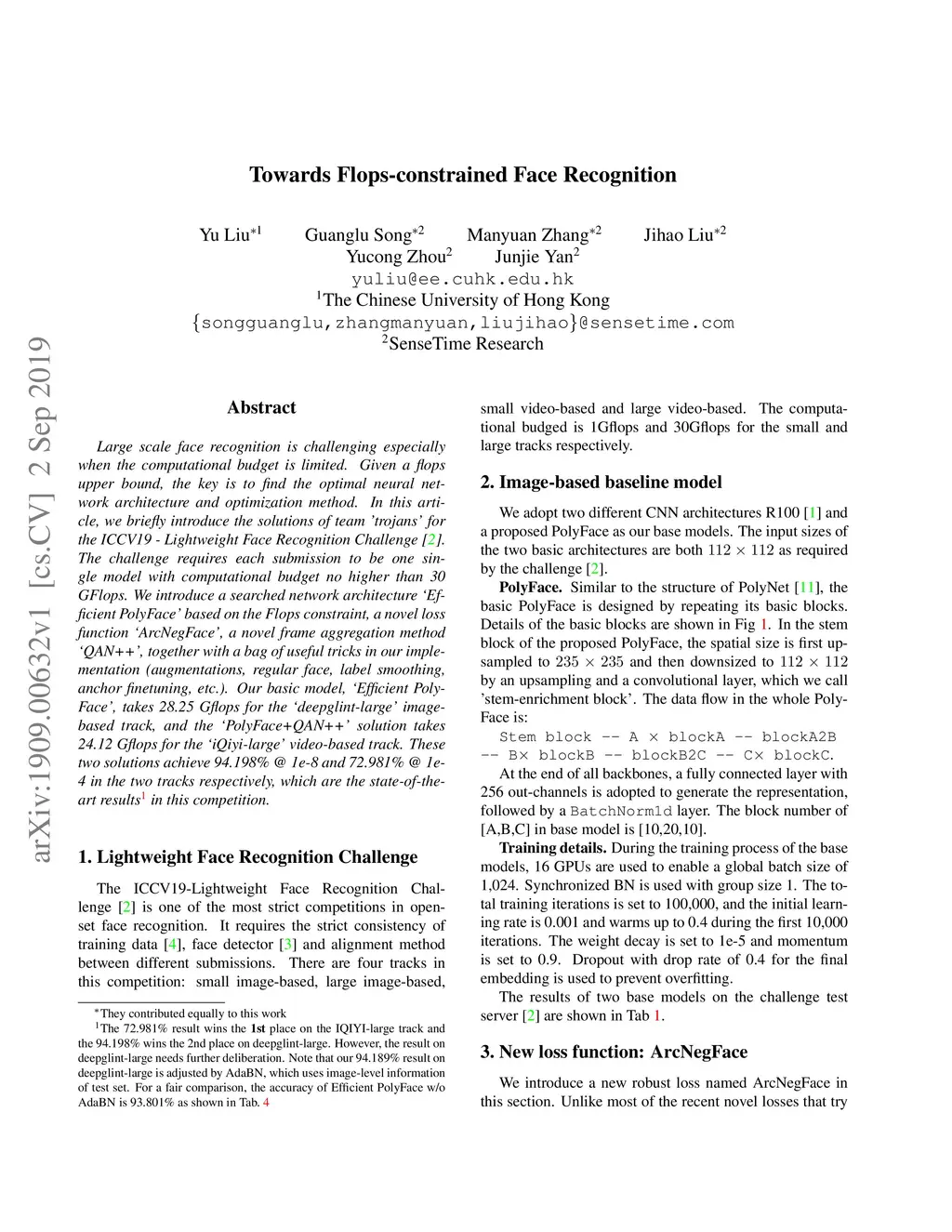 Large scale face recognition is challenging especially when the computational budget is limited. Given a \textit{flops} upper bound, the key is to find the optimal neural network architecture and optimization method. In this article, we briefly introduce the solutions of team 'trojans' for the ICCV19 - Lightweight Face Recognition Challenge~\cite{lfr}. The challenge requires each submission to be one single model with the computational budget no higher than 30 GFlops. We introduce a searched network architecture `Efficient PolyFace' based on the Flops constraint, a novel loss function `ArcNegFace', a novel frame aggregation method `QAN++', together with a bag of useful tricks in our implementation (augmentations, regular face, label smoothing, anchor finetuning, etc.). Our basic model, `Efficient PolyFace', takes 28.25 Gflops for the `deepglint-large' image-based track, and the `PolyFace+QAN++' solution takes 24.12 Gflops for the `iQiyi-large' video-based track. These two solutions achieve 94.198\% @ 1e-8 and 72.981\% @ 1e-4 in the two tracks respectively, which are the state-of-the-art results.