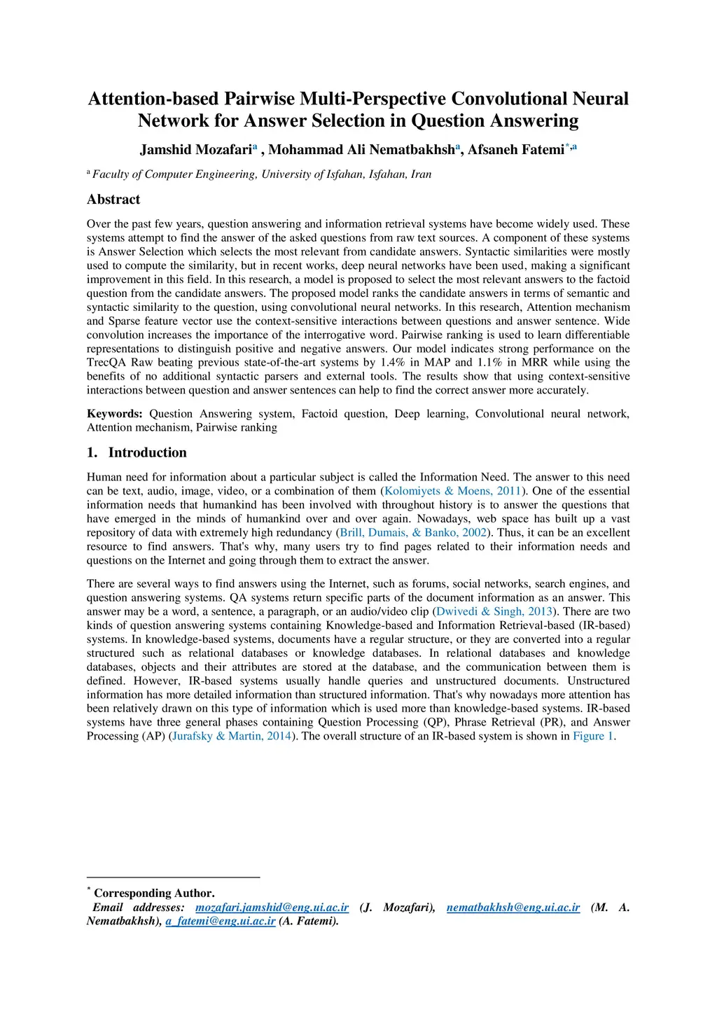 Over the past few years, question answering and information retrieval systems have become widely used. These systems attempt to find the answer of the asked questions from raw text sources. A component of these systems is Answer Selection which selects the most relevant from candidate answers. Syntactic similarities were mostly used to compute the similarity, but in recent works, deep neural networks have been used, making a significant improvement in this field. In this research, a model is proposed to select the most relevant answers to the factoid question from the candidate answers. The proposed model ranks the candidate answers in terms of semantic and syntactic similarity to the question, using convolutional neural networks. In this research, Attention mechanism and Sparse feature vector use the context-sensitive interactions between questions and answer sentence. Wide convolution increases the importance of the interrogative word. Pairwise ranking is used to learn differentiable representations to distinguish positive and negative answers. Our model indicates strong performance on the TrecQA Raw beating previous state-of-the-art systems by 1.4% in MAP and 1.1% in MRR while using the benefits of no additional syntactic parsers and external tools. The results show that using context-sensitive interactions between question and answer sentences can help to find the correct answer more accurately.