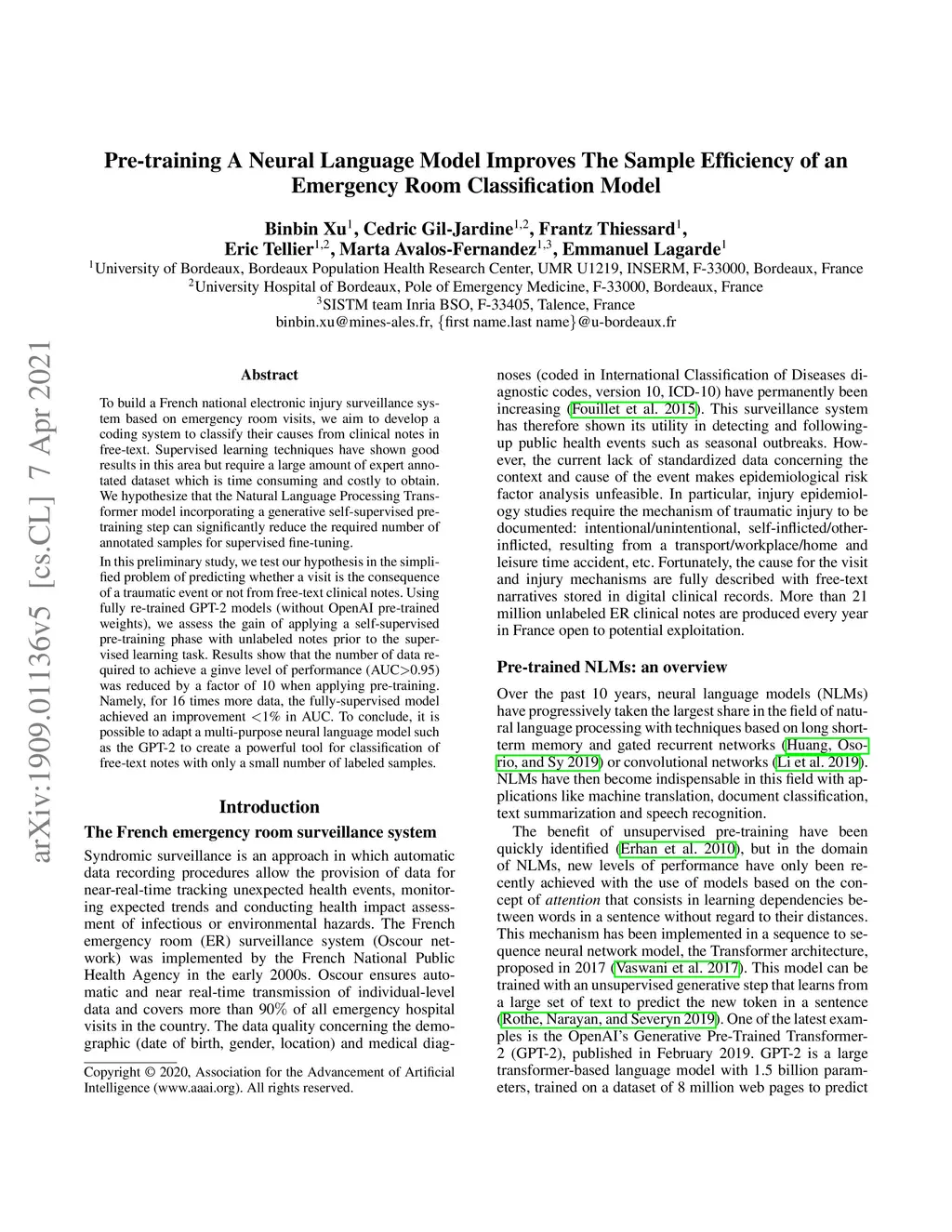 To build a French national electronic injury surveillance system based on emergency room visits, we aim to develop a coding system to classify their causes from clinical notes in free-text. Supervised learning techniques have shown good results in this area but require a large amount of expert annotated dataset which is time consuming and costly to obtain. We hypothesize that the Natural Language Processing Transformer model incorporating a generative self-supervised pre-training step can significantly reduce the required number of annotated samples for supervised fine-tuning. In this preliminary study, we test our hypothesis in the simplified problem of predicting whether a visit is the consequence of a traumatic event or not from free-text clinical notes. Using fully re-trained GPT-2 models (without OpenAI pre-trained weights), we assess the gain of applying a self-supervised pre-training phase with unlabeled notes prior to the supervised learning task. Results show that the number of data required to achieve a ginve level of performance (AUC>0.95) was reduced by a factor of 10 when applying pre-training. Namely, for 16 times more data, the fully-supervised model achieved an improvement <1% in AUC. To conclude, it is possible to adapt a multi-purpose neural language model such as the GPT-2 to create a powerful tool for classification of free-text notes with only a small number of labeled samples.