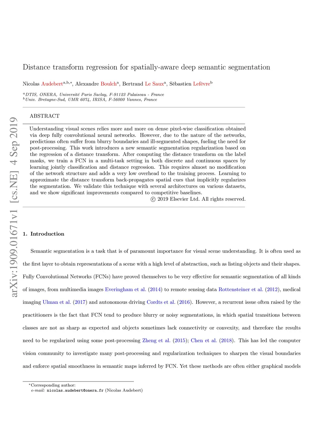Understanding visual scenes relies more and more on dense pixel-wise classification obtained via deep fully convolutional neural networks. However, due to the nature of the networks, predictions often suffer from blurry boundaries and ill-segmented shapes, fueling the need for post-processing. This work introduces a new semantic segmentation regularization based on the regression of a distance transform. After computing the distance transform on the label masks, we train a FCN in a multi-task setting in both discrete and continuous spaces by learning jointly classification and distance regression. This requires almost no modification of the network structure and adds a very low overhead to the training process. Learning to approximate the distance transform back-propagates spatial cues that implicitly regularizes the segmentation. We validate this technique with several architectures on various datasets, and we show significant improvements compared to competitive baselines.