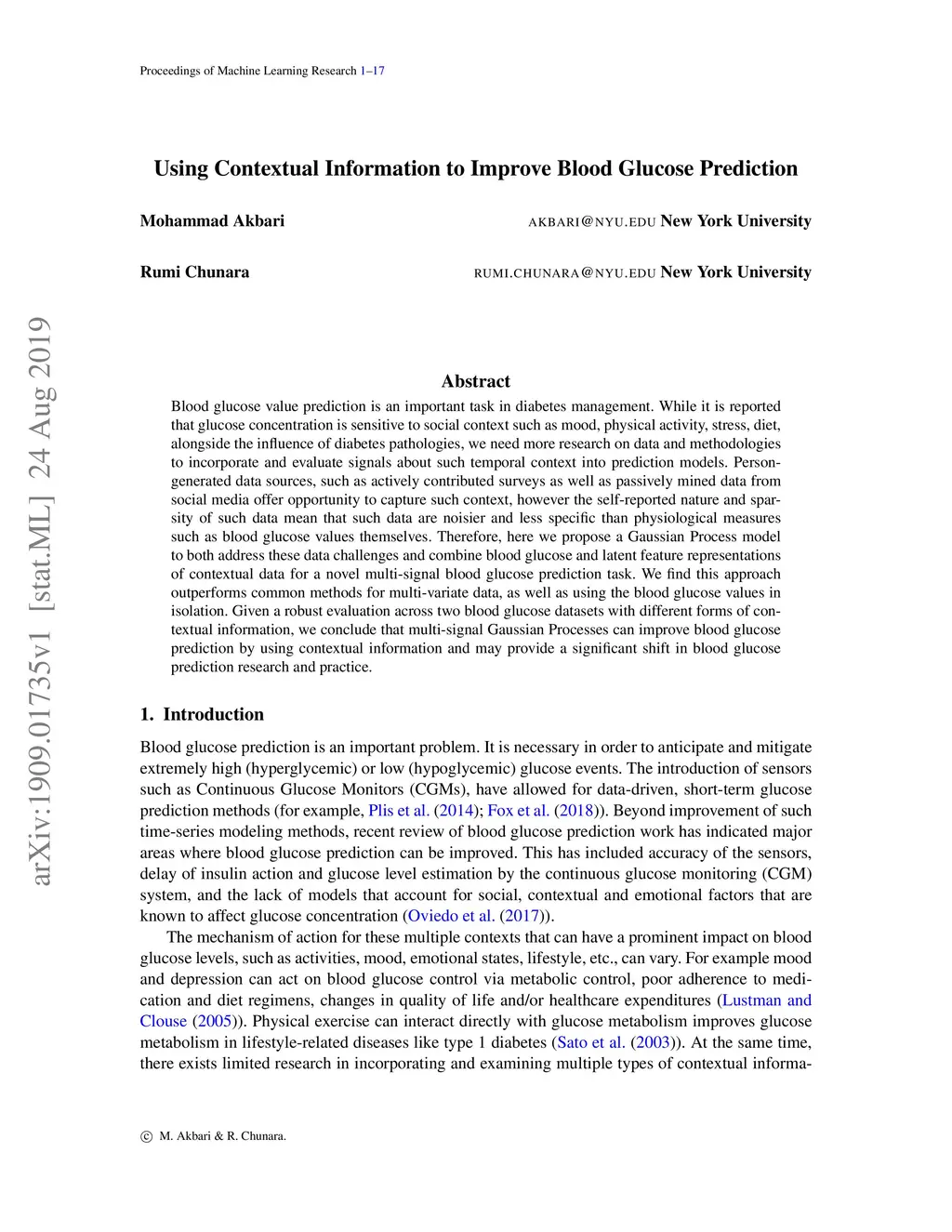 Blood glucose value prediction is an important task in diabetes management. While it is reported that glucose concentration is sensitive to social context such as mood, physical activity, stress, diet, alongside the influence of diabetes pathologies, we need more research on data and methodologies to incorporate and evaluate signals about such temporal context into prediction models. Person-generated data sources, such as actively contributed surveys as well as passively mined data from social media offer opportunity to capture such context, however the self-reported nature and sparsity of such data mean that such data are noisier and less specific than physiological measures such as blood glucose values themselves. Therefore, here we propose a Gaussian Process model to both address these data challenges and combine blood glucose and latent feature representations of contextual data for a novel multi-signal blood glucose prediction task. We find this approach outperforms common methods for multi-variate data, as well as using the blood glucose values in isolation. Given a robust evaluation across two blood glucose datasets with different forms of contextual information, we conclude that multi-signal Gaussian Processes can improve blood glucose prediction by using contextual information and may provide a significant shift in blood glucose prediction research and practice.