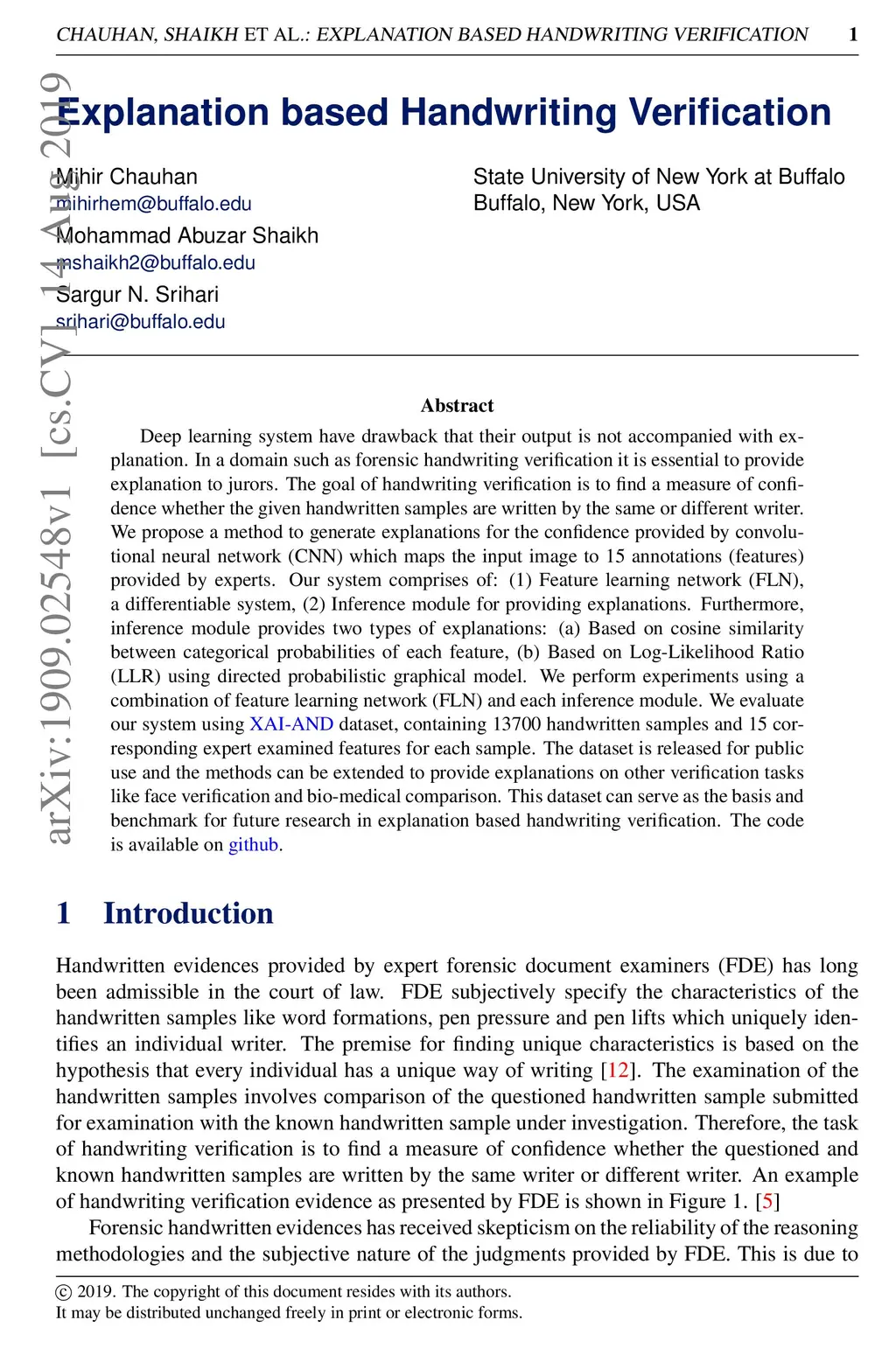 Deep learning system have drawback that their output is not accompanied with ex-planation. In a domain such as forensic handwriting verification it is essential to provideexplanation to jurors. The goal of handwriting verification is to find a measure of confi-dence whether the given handwritten samples are written by the same or different writer.We propose a method to generate explanations for the confidence provided by convolu-tional neural network (CNN) which maps the input image to 15 annotations (features)provided by experts. Our system comprises of: (1) Feature learning network (FLN),a differentiable system, (2) Inference module for providing explanations. Furthermore,inference module provides two types of explanations: (a) Based on cosine similaritybetween categorical probabilities of each feature, (b) Based on Log-Likelihood Ratio(LLR) using directed probabilistic graphical model. We perform experiments using acombination of feature learning network (FLN) and each inference module. We evaluateour system using XAI-AND dataset, containing 13700 handwritten samples and 15 cor-responding expert examined features for each sample. The dataset is released for publicuse and the methods can be extended to provide explanations on other verification taskslike face verification and bio-medical comparison. This dataset can serve as the basis and benchmark for future research in explanation based handwriting verification. The code is available on github.