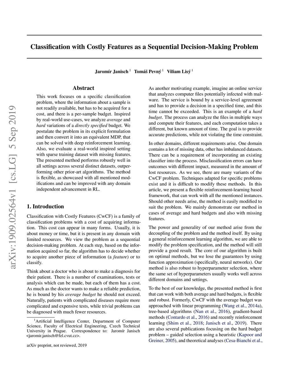 Classification with Costly Features as a Sequential Decision-Making