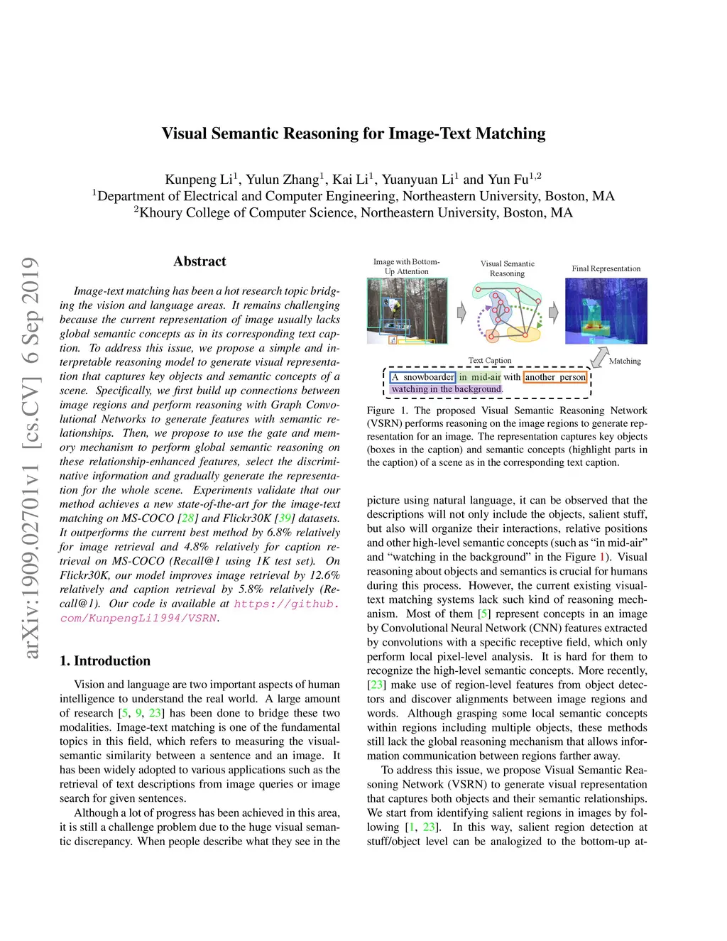 Image-text matching has been a hot research topic bridging the vision and language areas. It remains challenging because the current representation of image usually lacks global semantic concepts as in its corresponding text caption. To address this issue, we propose a simple and interpretable reasoning model to generate visual representation that captures key objects and semantic concepts of a scene. Specifically, we first build up connections between image regions and perform reasoning with Graph Convolutional Networks to generate features with semantic relationships. Then, we propose to use the gate and memory mechanism to perform global semantic reasoning on these relationship-enhanced features, select the discriminative information and gradually generate the representation for the whole scene. Experiments validate that our method achieves a new state-of-the-art for the image-text matching on MS-COCO and Flickr30K datasets. It outperforms the current best method by 6.8% relatively for image retrieval and 4.8% relatively for caption retrieval on MS-COCO (Recall@1 using 1K test set). On Flickr30K, our model improves image retrieval by 12.6% relatively and caption retrieval by 5.8% relatively (Recall@1). Our code is available at https://github.com/KunpengLi1994/VSRN.